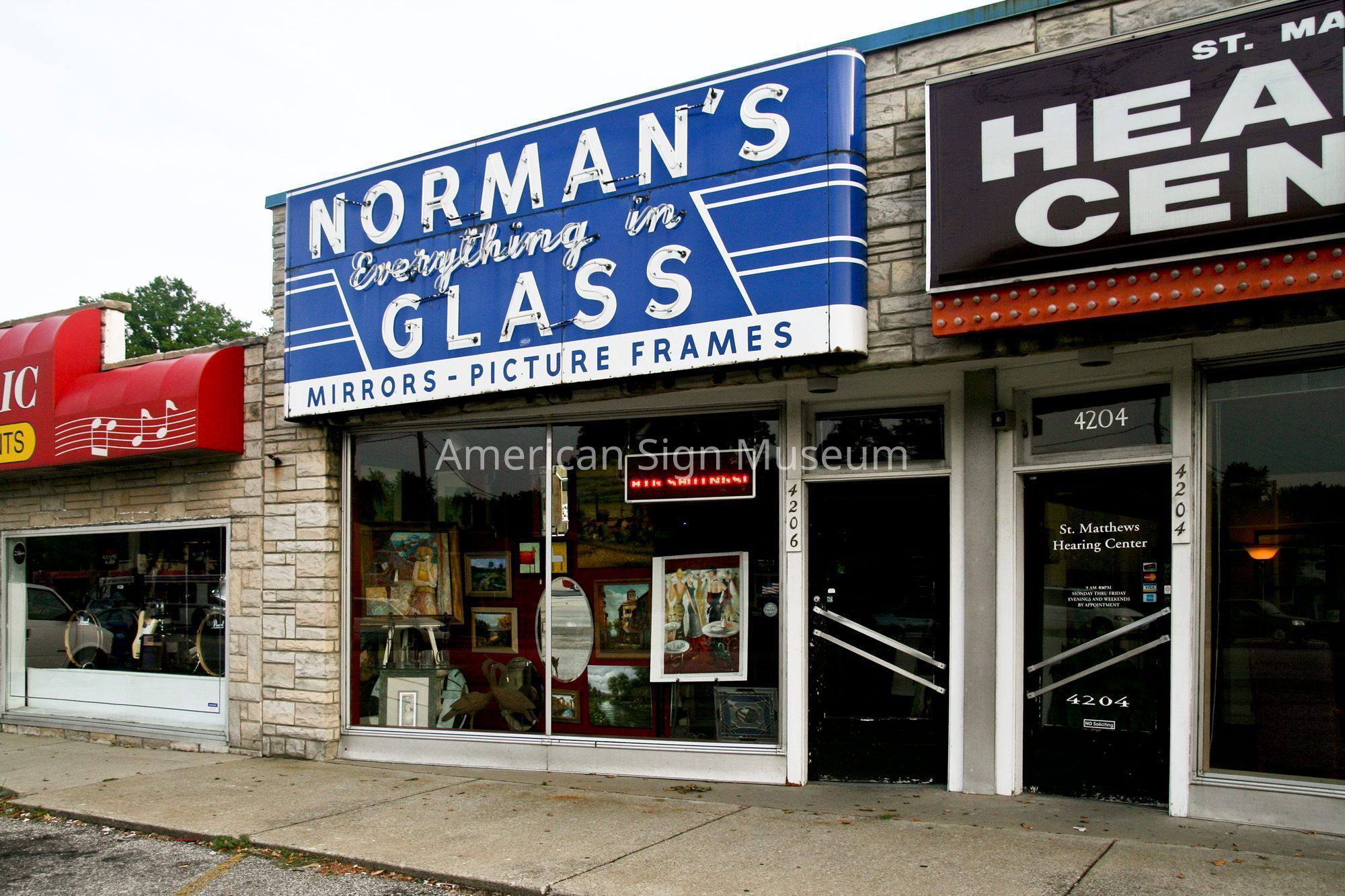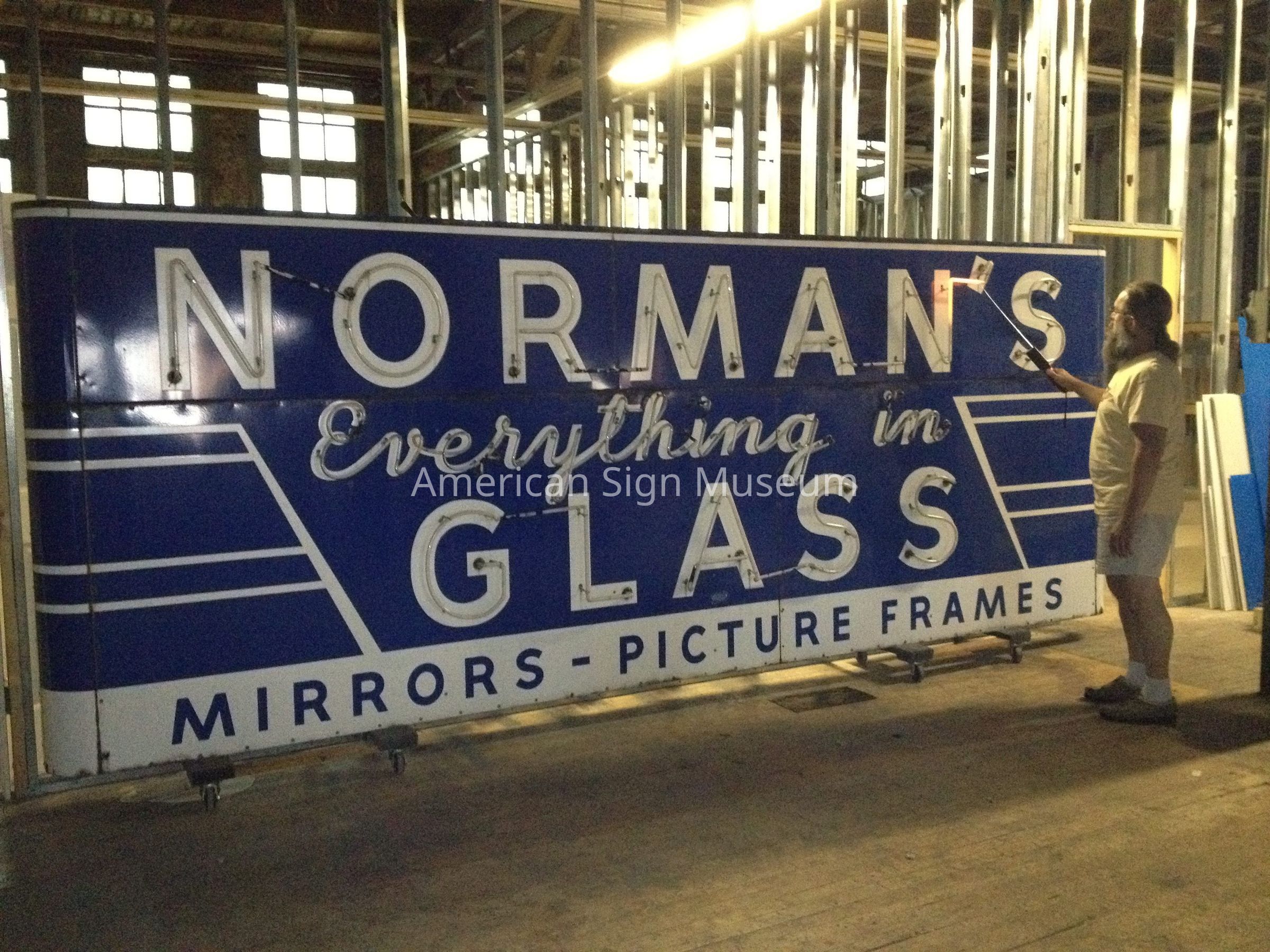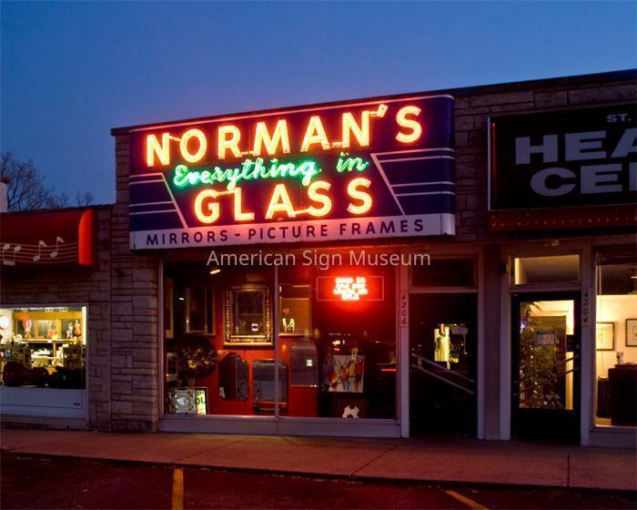 A late 1940s, single-faced porcelain enamel and neon that was displayed on the facade of the Norman Glass business in Louisville KY.Collection