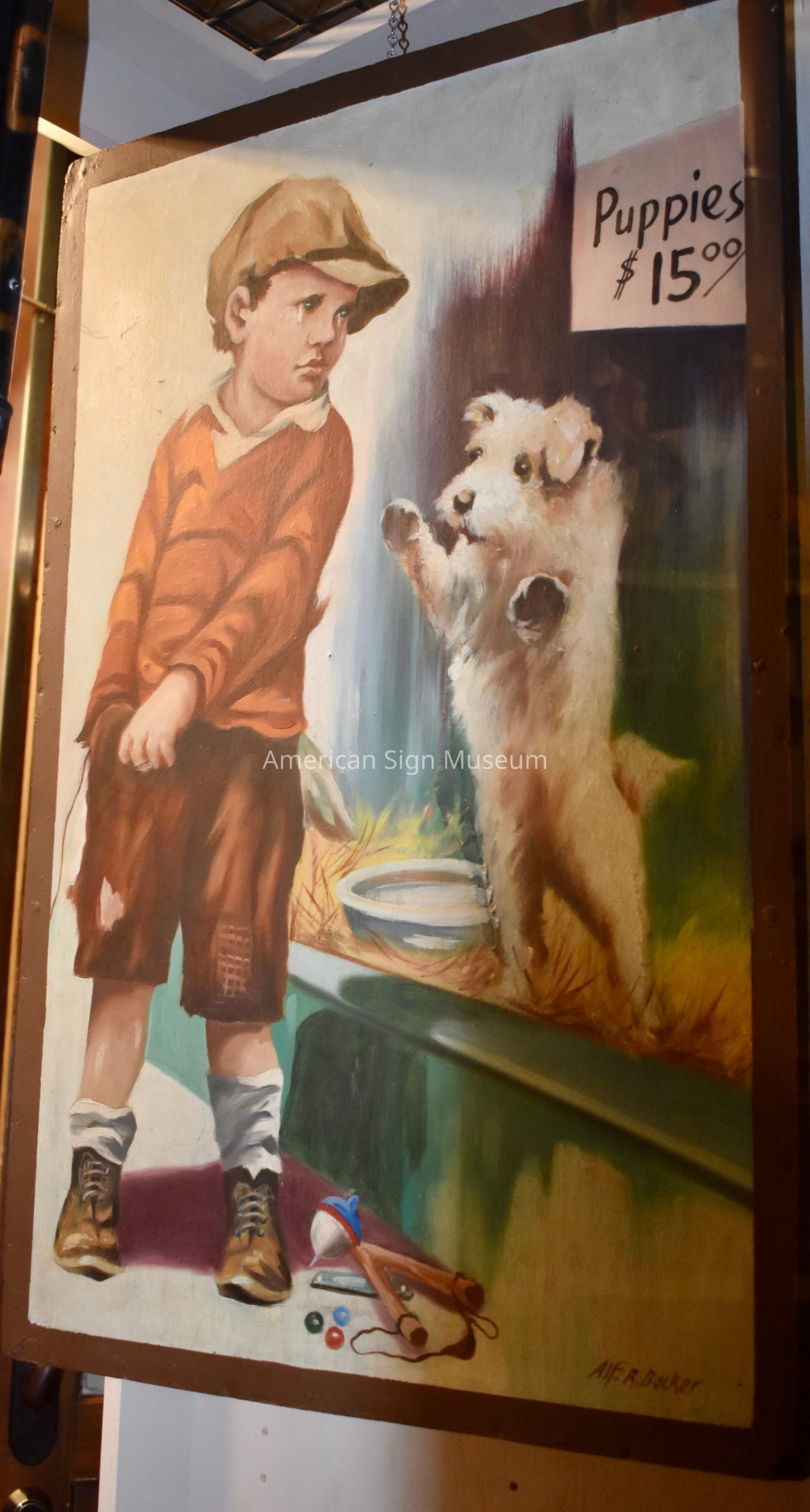 Oil painting by Alf R. Becker from a popular Norman Rockwell theme featuring a young bog outside a window advertising 'Puppies $15.00'. This particular image was painted by Alf R. Becker in the 1950s for his friend, John L. McCarthy, former vice president of the Iron Workers Union. McCarthy was a longtime resident of St. Louis and was born in East St. Louis in 1904.Collection