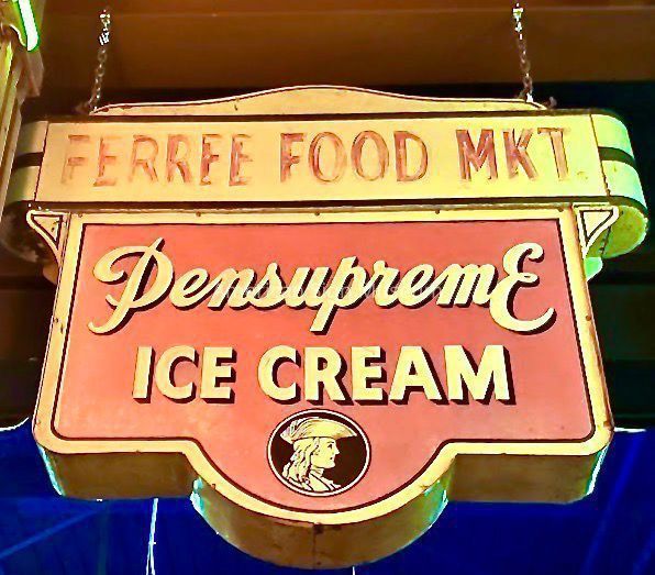 "Pensupreme Ice Cream" tin sign is double-faced with embossed, hand-painted faces and bullnose corners on top panel. The hand-painted courtesy line reads, "Ferree Food Market." Ferree Food was a grocery store that open in the early 1950’s in York, PA, located at 835 Prospect St. It closed in 1980. It was owned by Rodger Ferree and this spouse, Annamary Ferree. PenSupreme was the brand of ice cream manufactured by Penn Dairies of Lancaster, PA.Collection