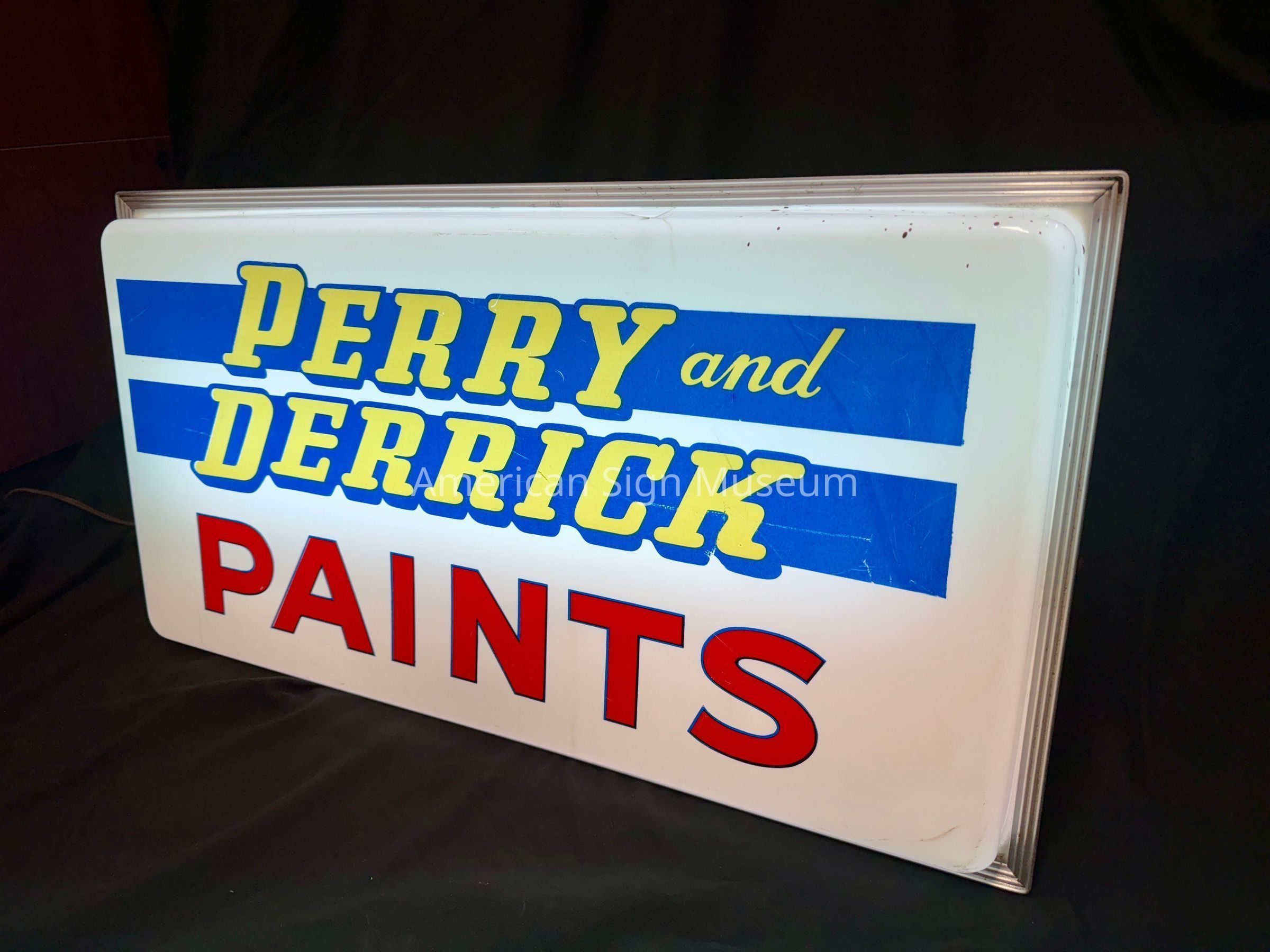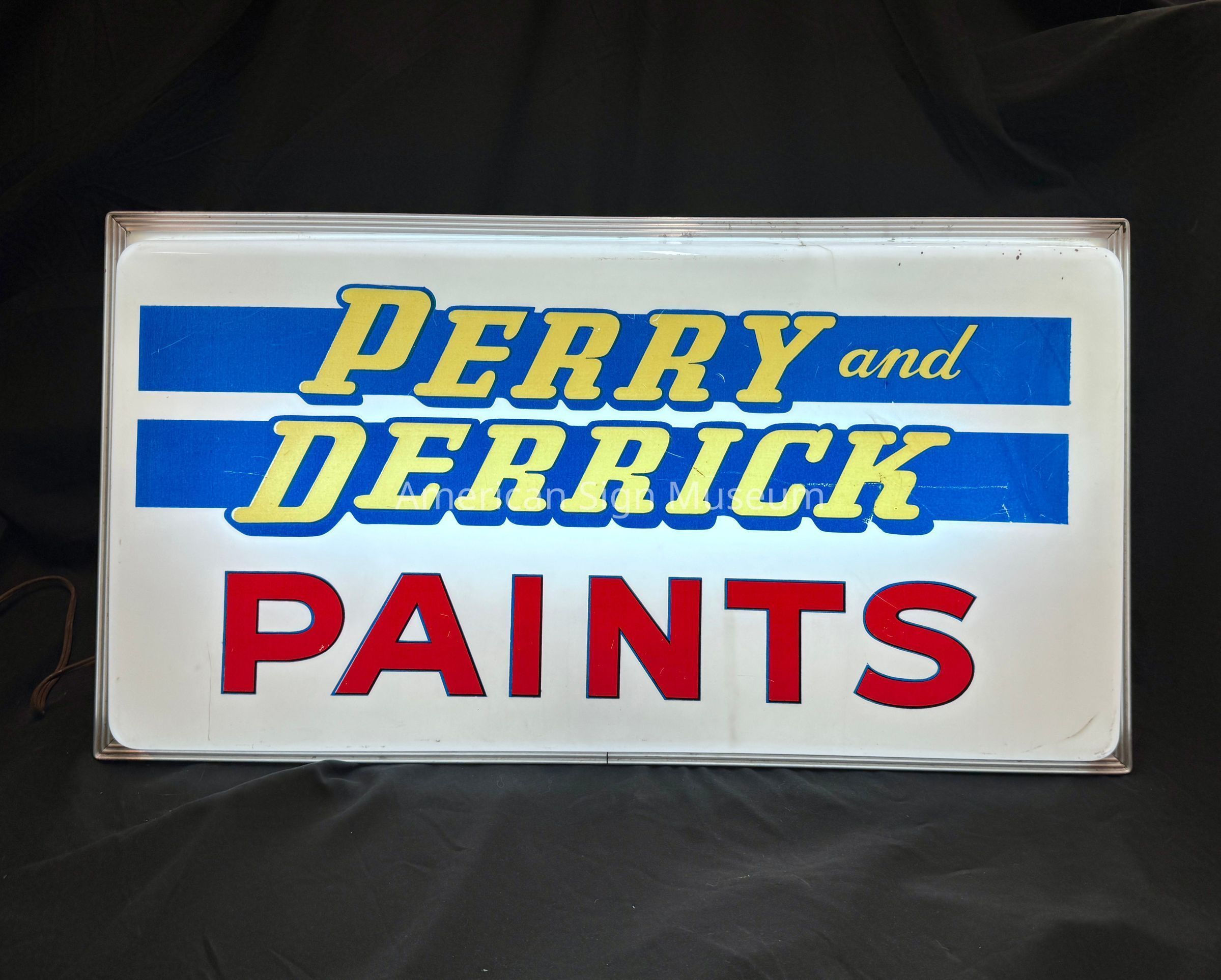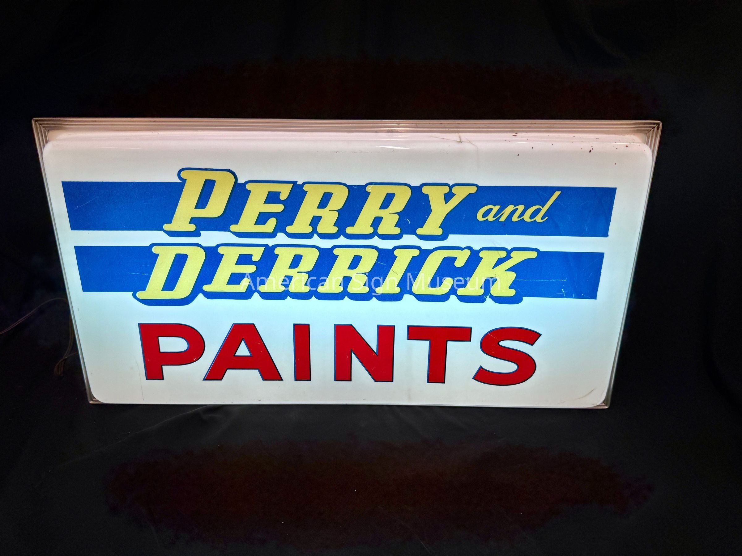 A single-faced, internally-illuminated plastic sign that reads, "Perry and Derrick Paints." It has screen-printed graphics: two horizontal blue blocks upon which there is yellow text, and "Paints" in red. It has an aluminum frame as well as a galvanized metal backing/cabinet.Collection