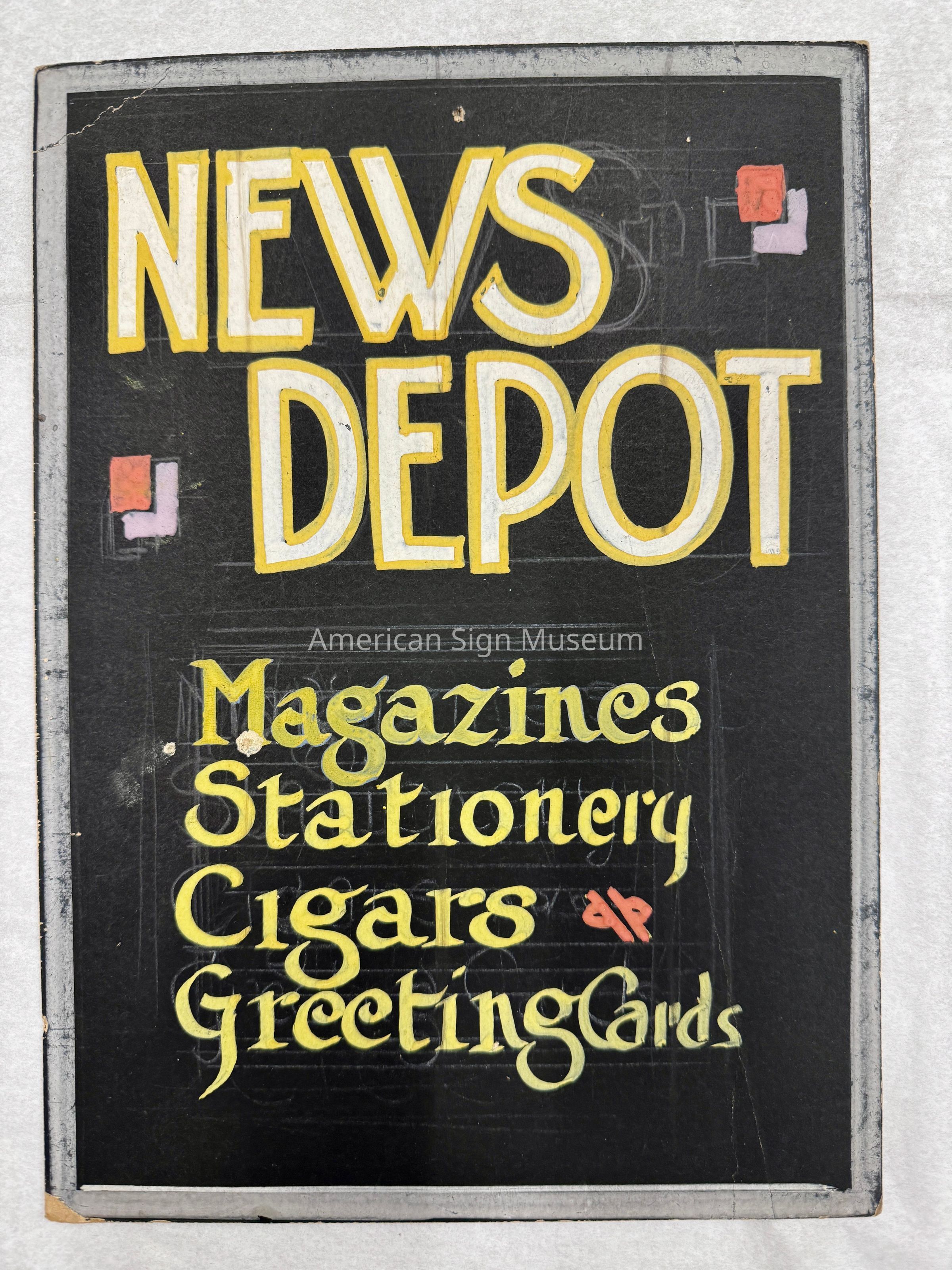 Sample handlettered showcard by Pfister Art Service, Niles, MI, reads, "News depot - Magazines, Stationary, Cigars, & Greeting Cards."Artwork Details