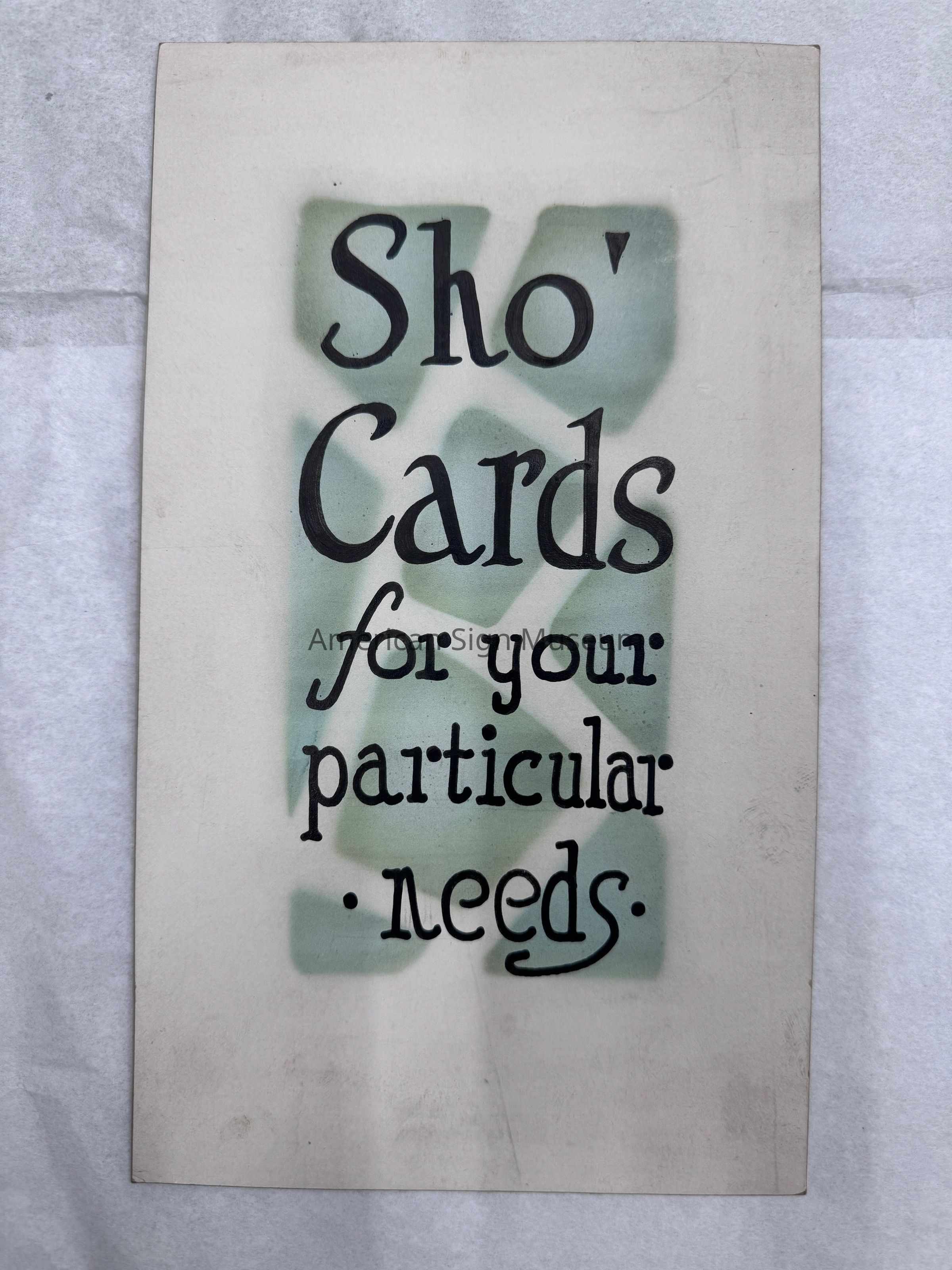 Sample handlettered showcard by Pfister Art Service, Niles, MI, reads, "Sho' cards for your particular needs."Collection