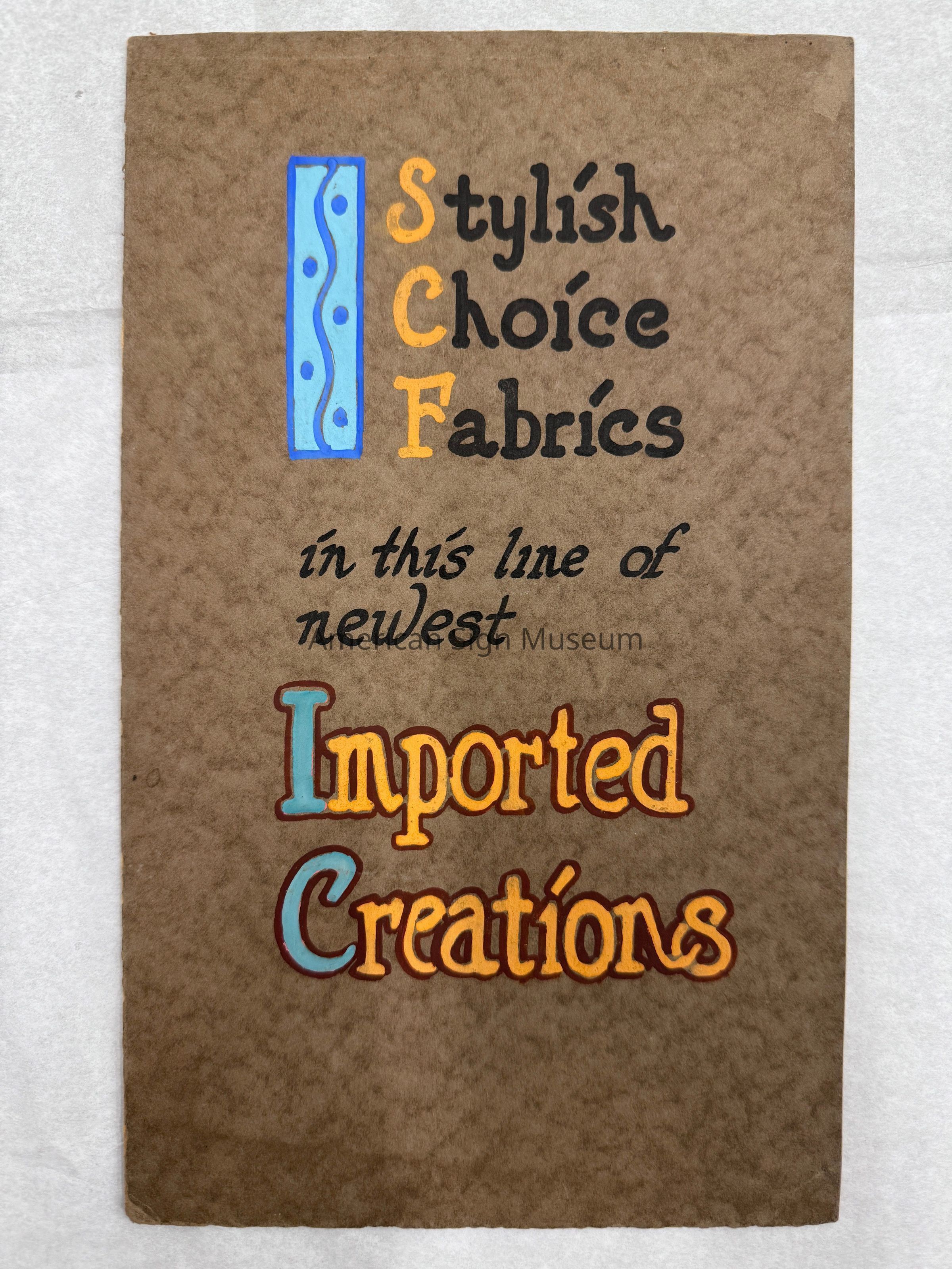 Sample handlettered showcard by Pfister Art Service, Niles, MI, reads, "Stylish choice fabrics in this line of newest imported creations."Collection
