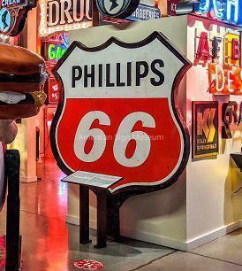 "Banjo-style" double-faced sign made of porcelain enamel for Phillips 66. It was most likely displayed at a gas station, high up on a pole--a method of presentation sometimes referred to as, "a lollipop."Collection