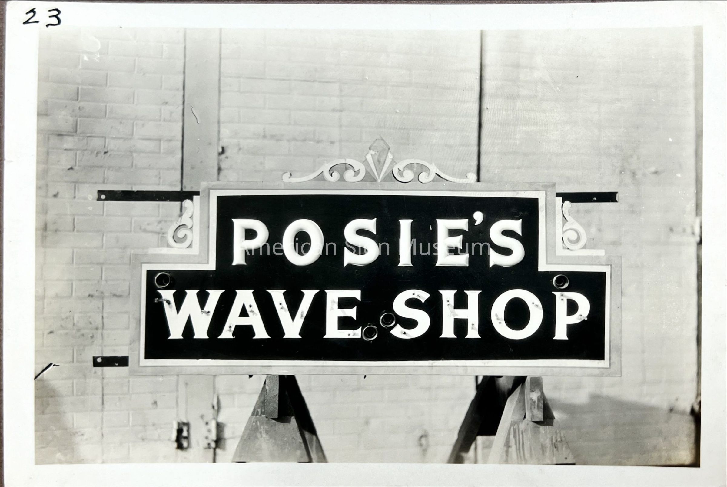 B&W photograph of early neon sign 1930-1940s - Posie's Wave Shop. Reverse reads "Size of can: 25"x5' Double face, Posie's - 6" opal, Wave Shop - 6" neon."Made/Created