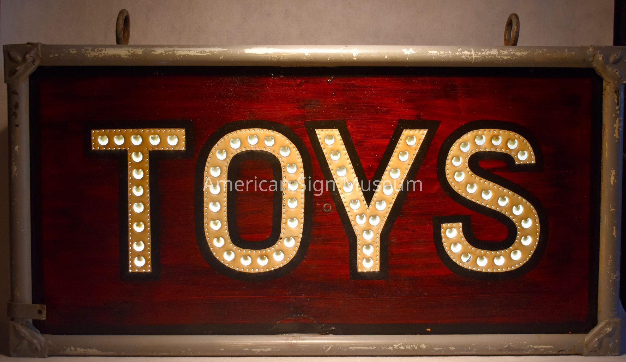 Sign was discovered by the museum founder in the window of a New York City toy store, specializing in mint-condition antique toys, while on a personal visit.