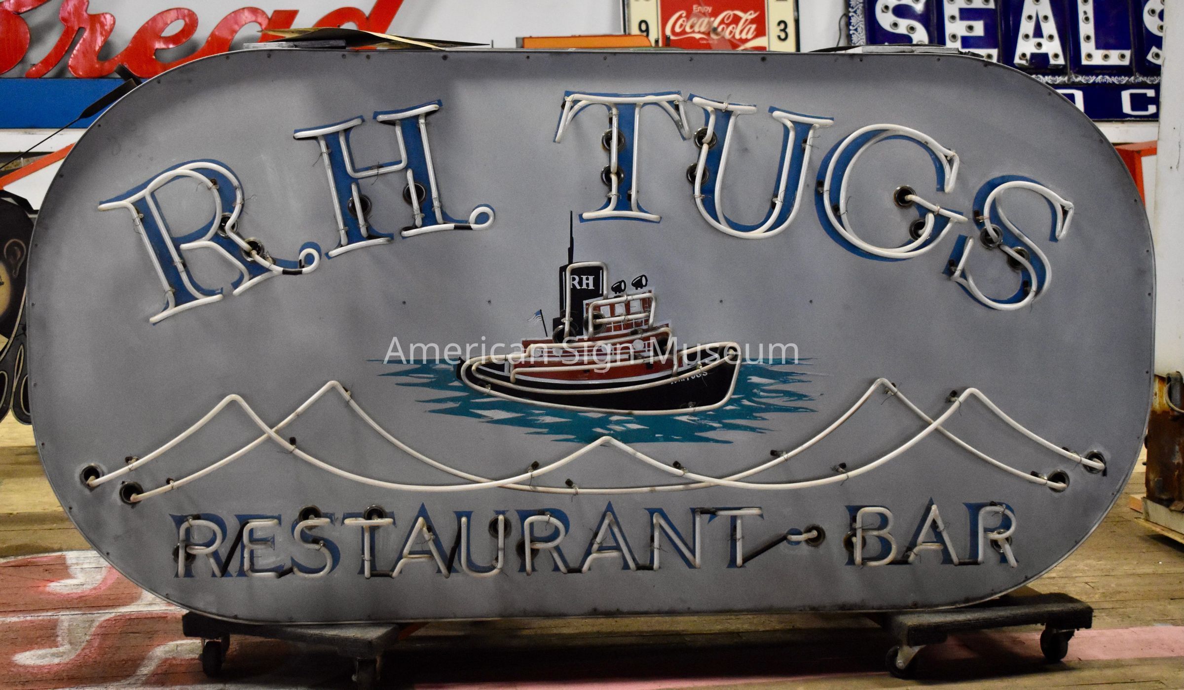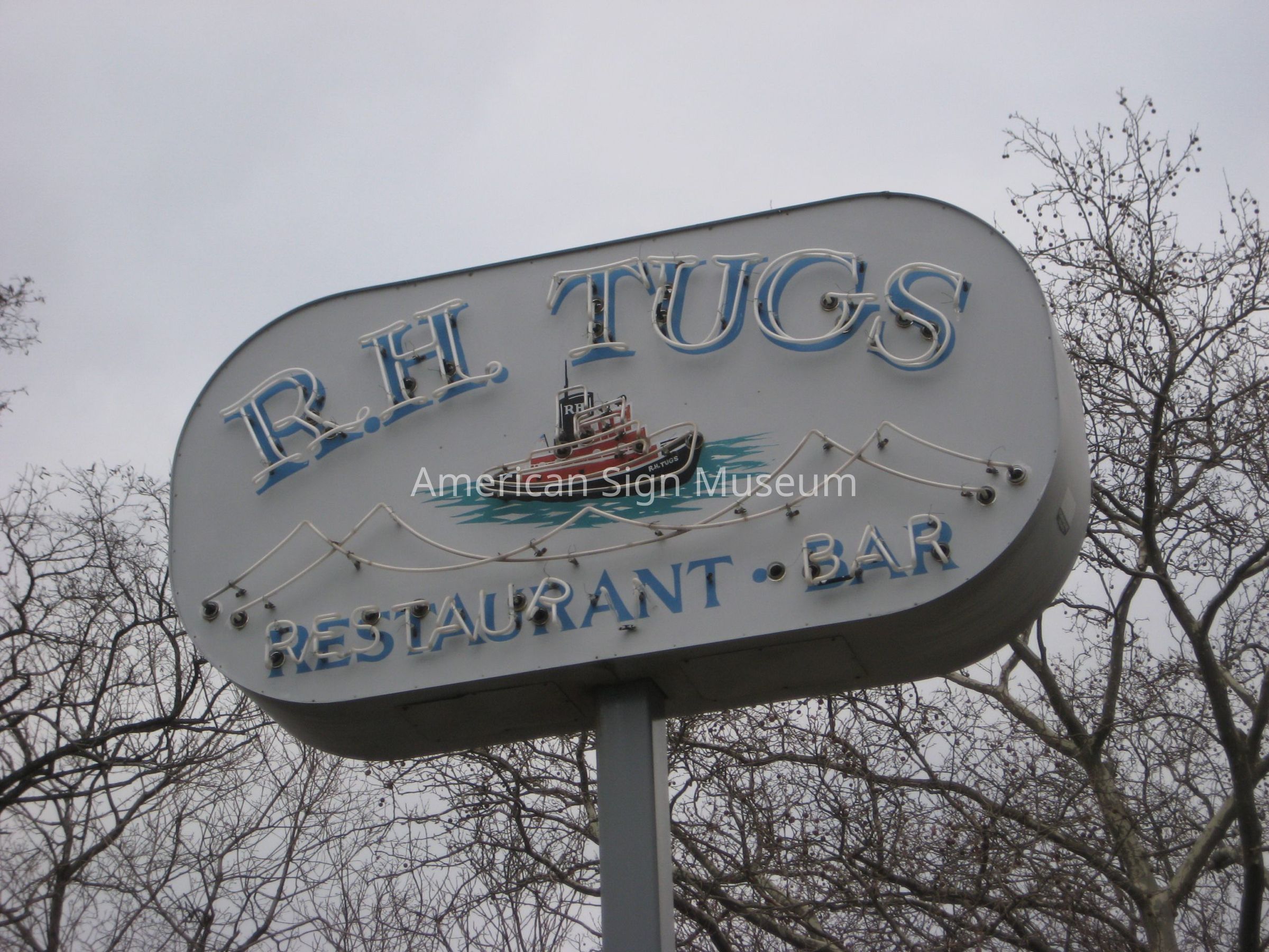 Double-faced, tin neon has painted pictorial of tug boat and identified the R.H. Tugs restaurant along the Kill Van Kull waterway near Staten Island, NY. The restaurant closed down in April, 2012 and the sign was removed by Frank Torrone & Sons Signs, Staten Island, NY. The museum was made aware of the possible availability of the sign by Frank Inzerillo, a local signpainter/pinstriper. A Perrysburg, OH sign crane manufacturer was also able to store the sign until it could be delivered to Cincinnati.Collection
