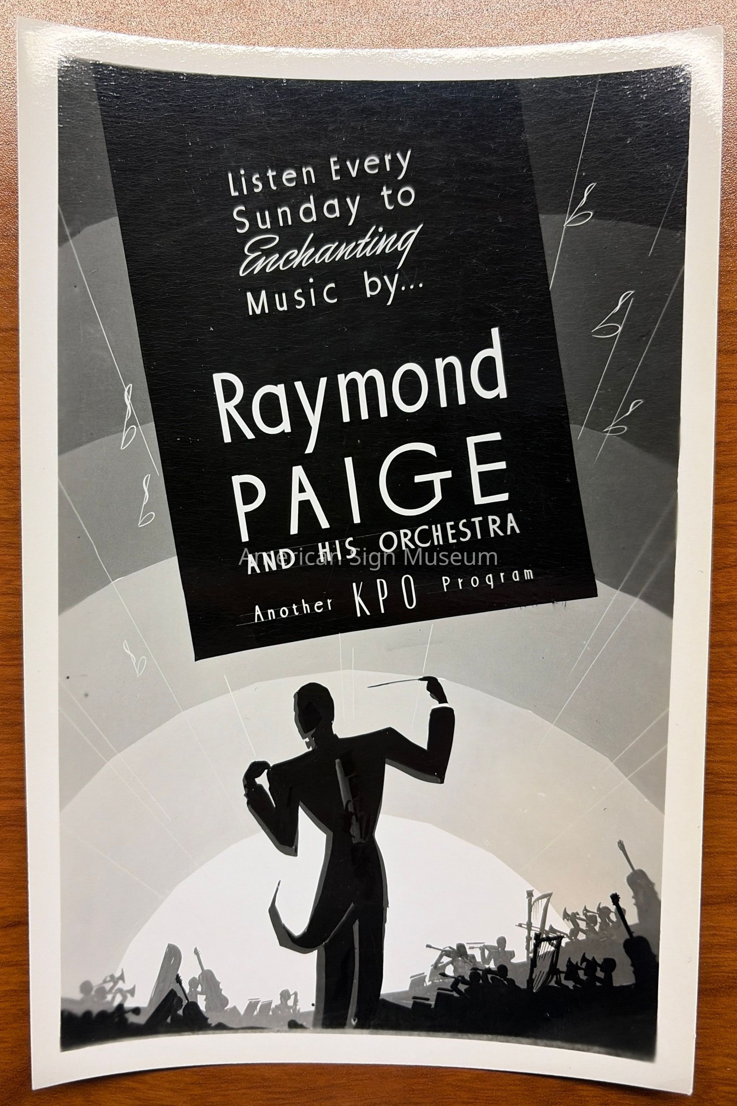 Black and white photograph of a show card reading "Listen Every Sunday to Enchanting Music by Raymond Paige and his Orchestra Another KPO Program ". Made by Don Sturdivant.Collection