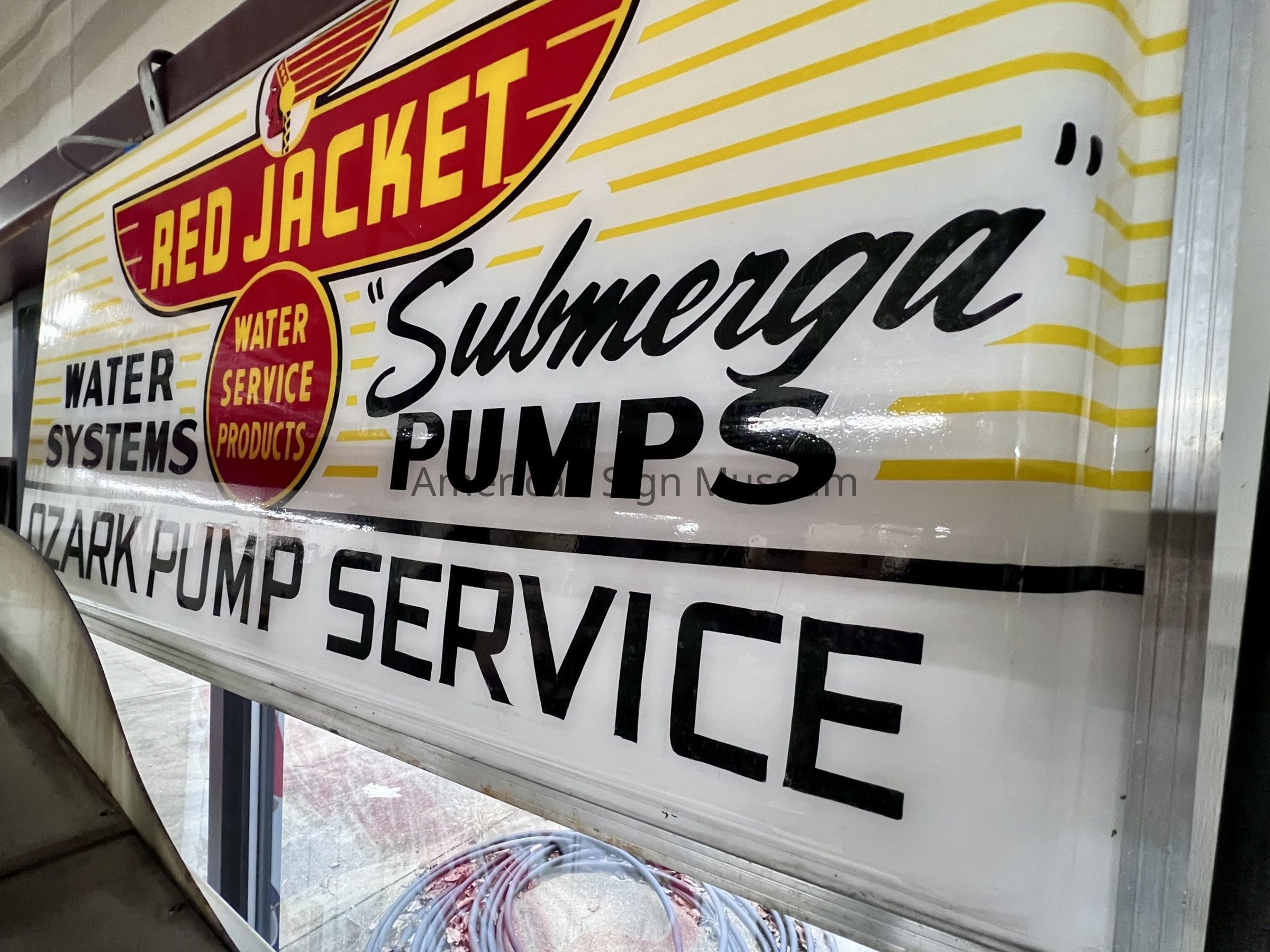 Internally-illuminated, vacuum-formed plastic sign for Red Jacket Water Service Products. There is a dark red top center emblem/logo, with phrases flanking to the left and right, "Water Systems", and "Submerga Pumps." the bottom text reads "Ozark Pump Service".Collection