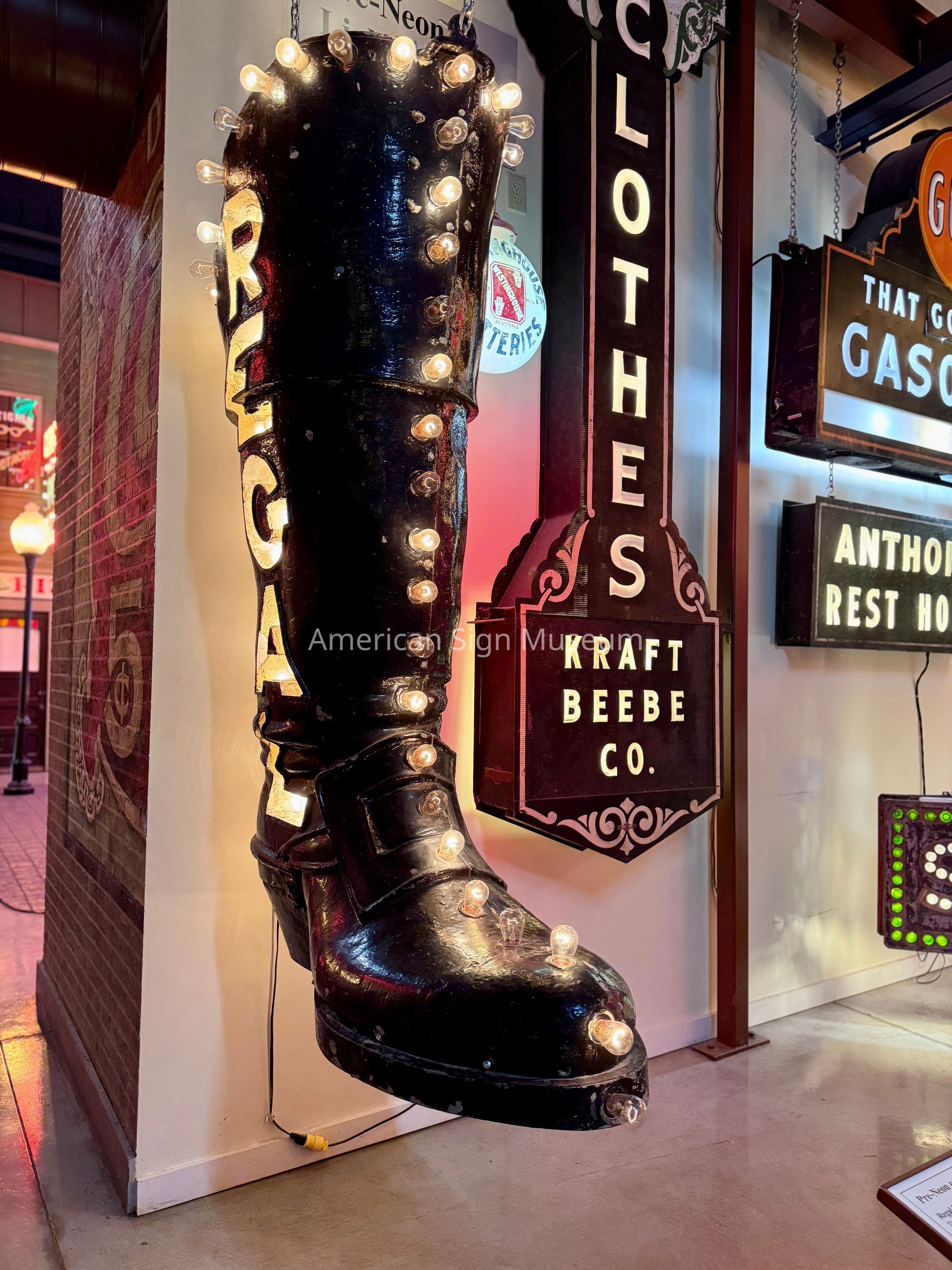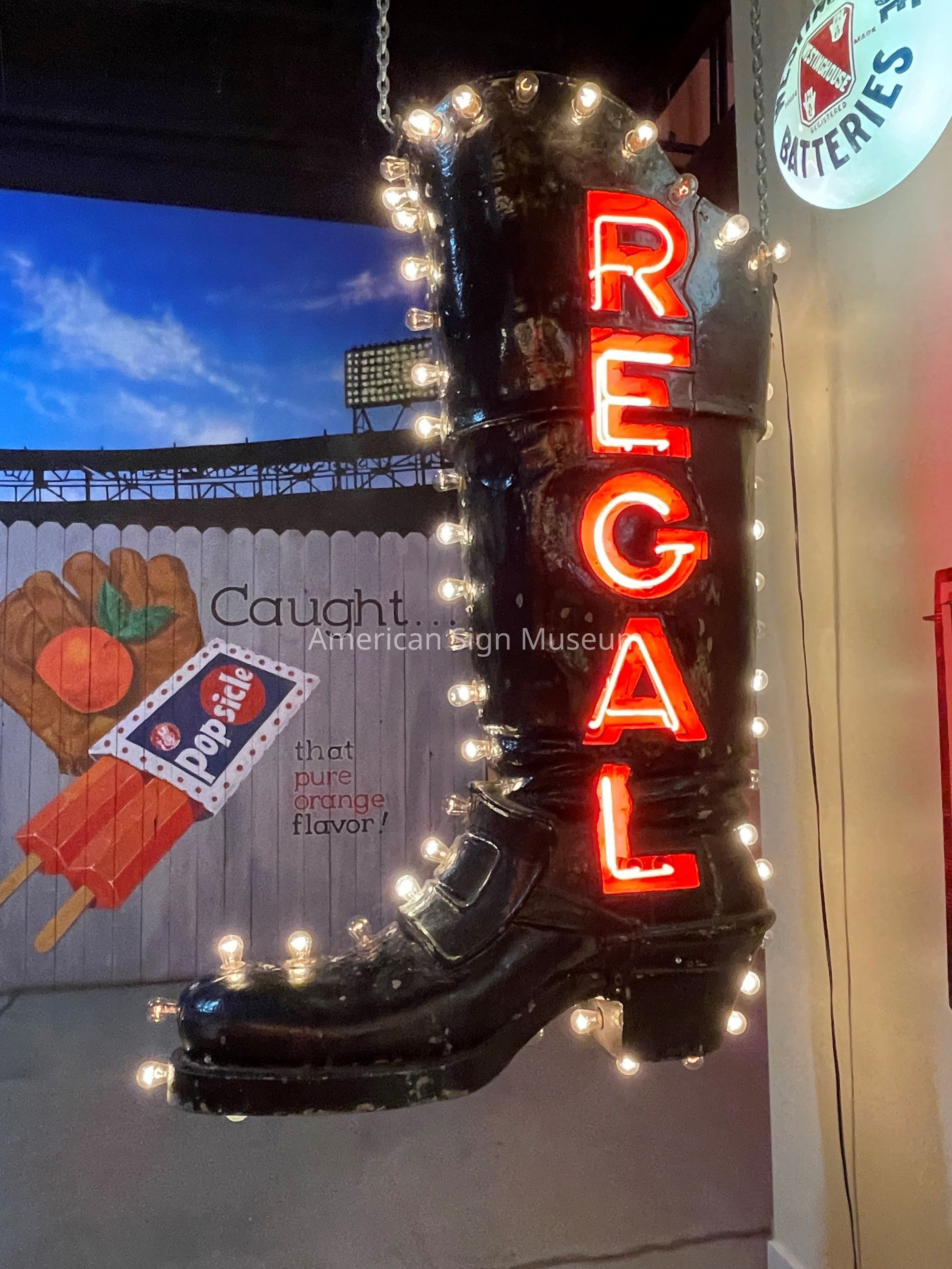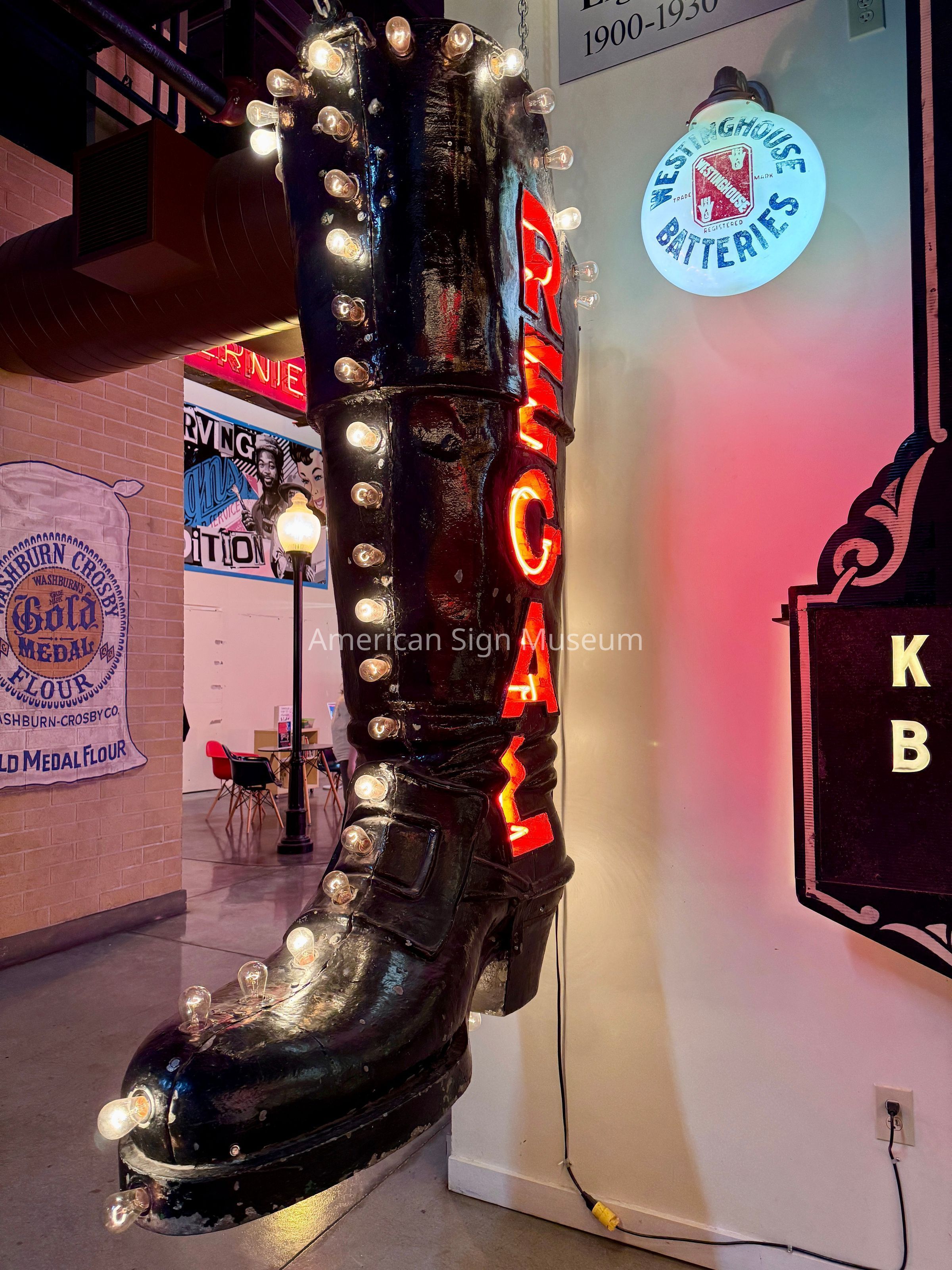 This three-dimensional, cast metal boot features neon one side and lightbulb illumination on the other. When the Museum acquired the sign, both sides had neon illumination, but it became evident during the restoration process that the boot was originally lightbulb-lit. One side was restored back to its original lightbulbs, and the other was left with the “updated” neon in order to show the sign’s history. Businesses would often refit an older sign with new technology as in the case of the Regal Boot usually to save money.Collection