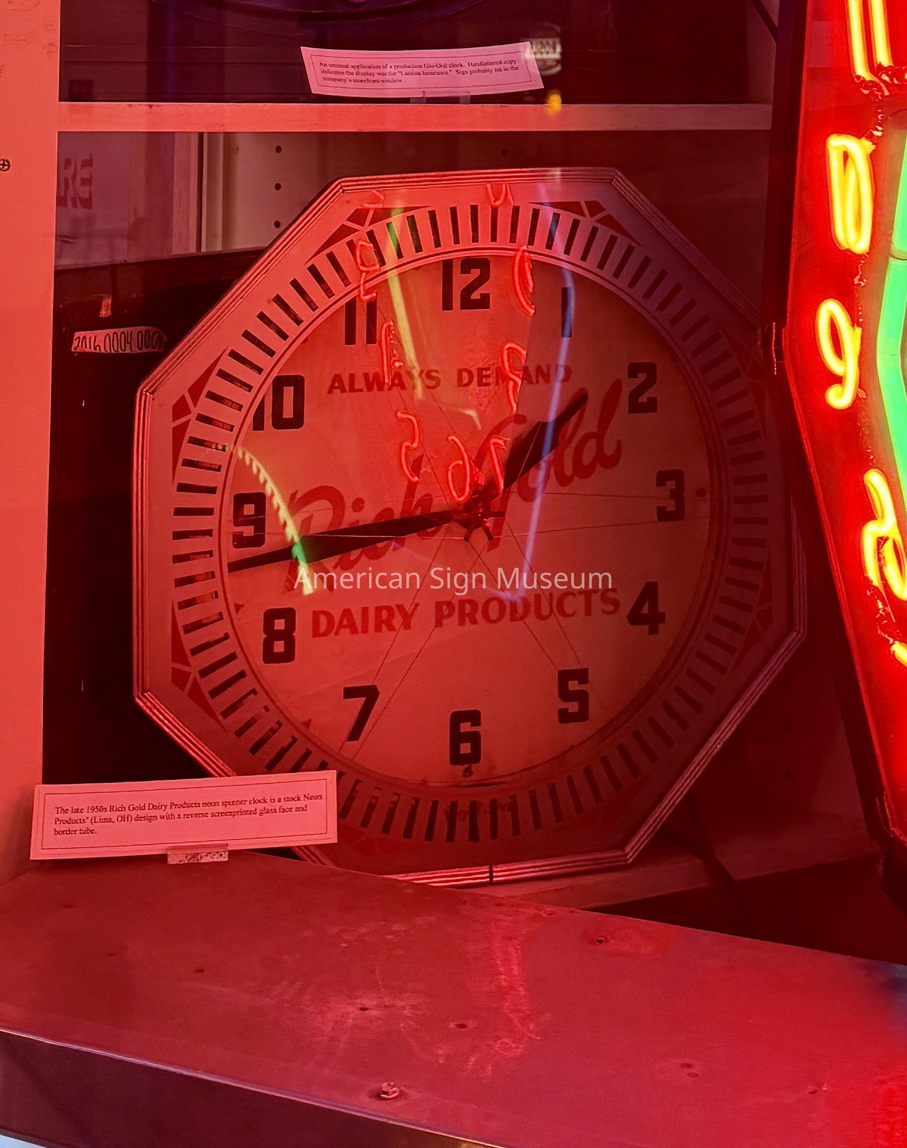 This late 1950s neon spinner clock advertised Rich Gold Dairy Products and was manufactured by Neon Products of Lima, OH. It has a reverse screen-printed glass face and neon border tube.Collection