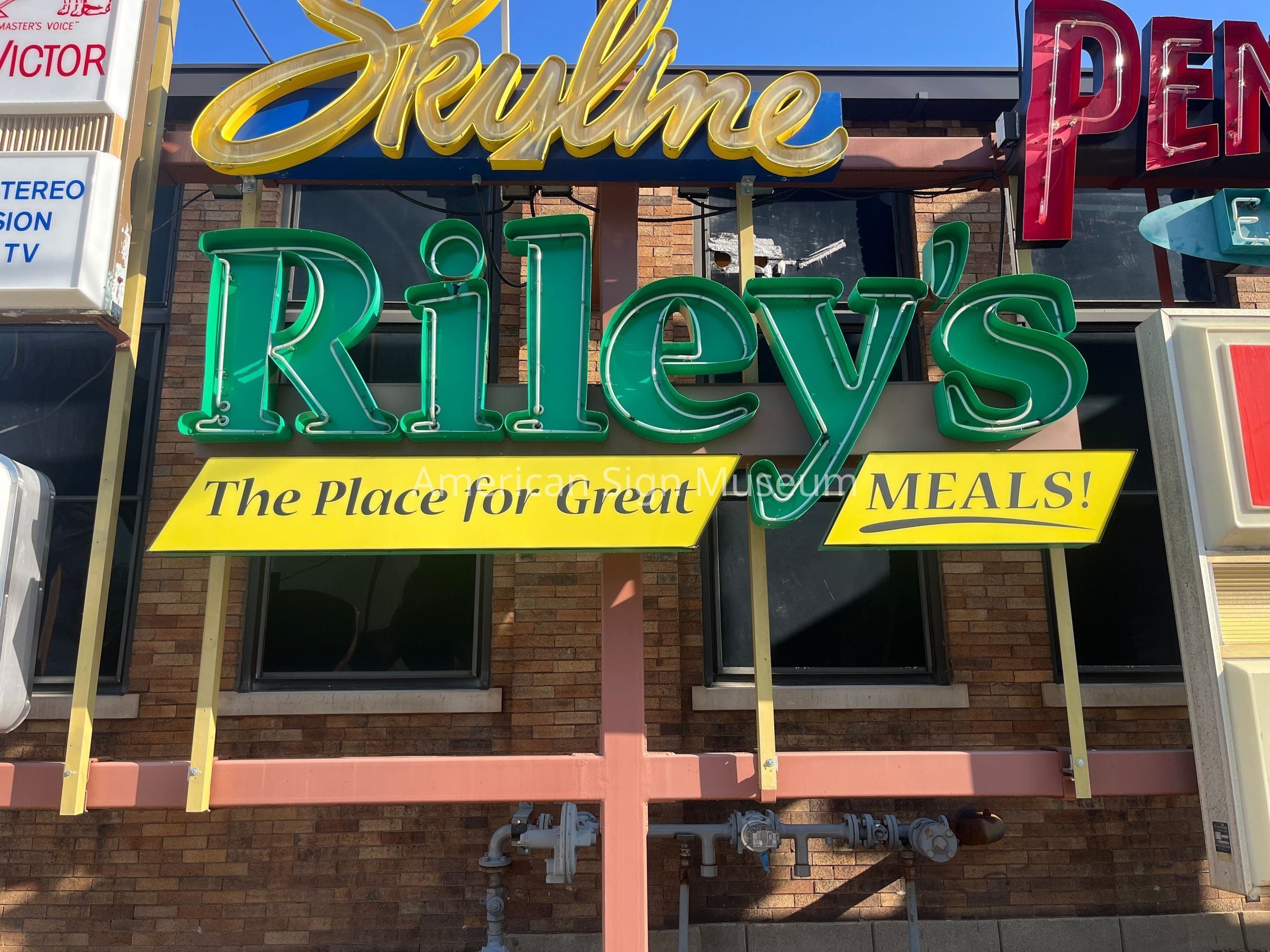 Single-faced, neon-illuminated sign for Riley's Restaurant with open channel lettering.Collection