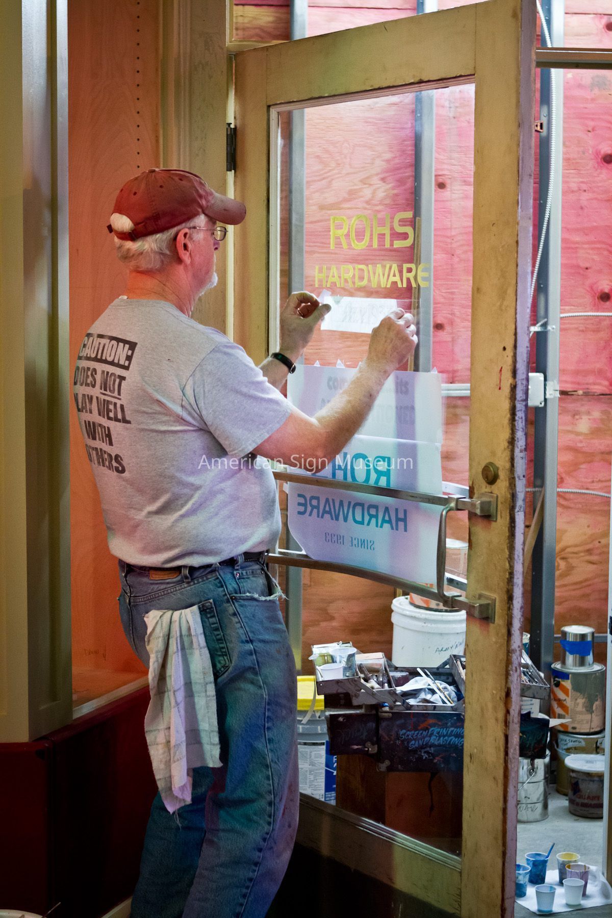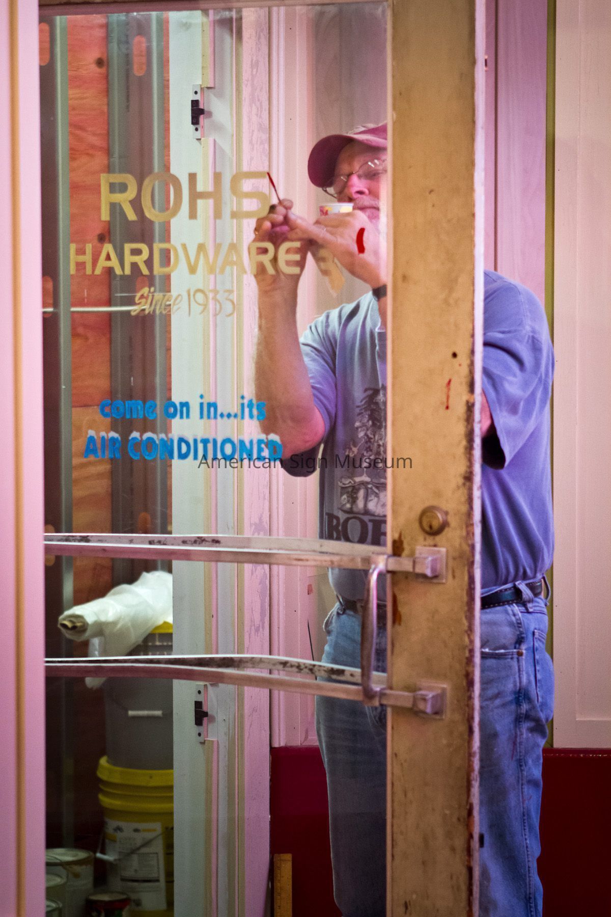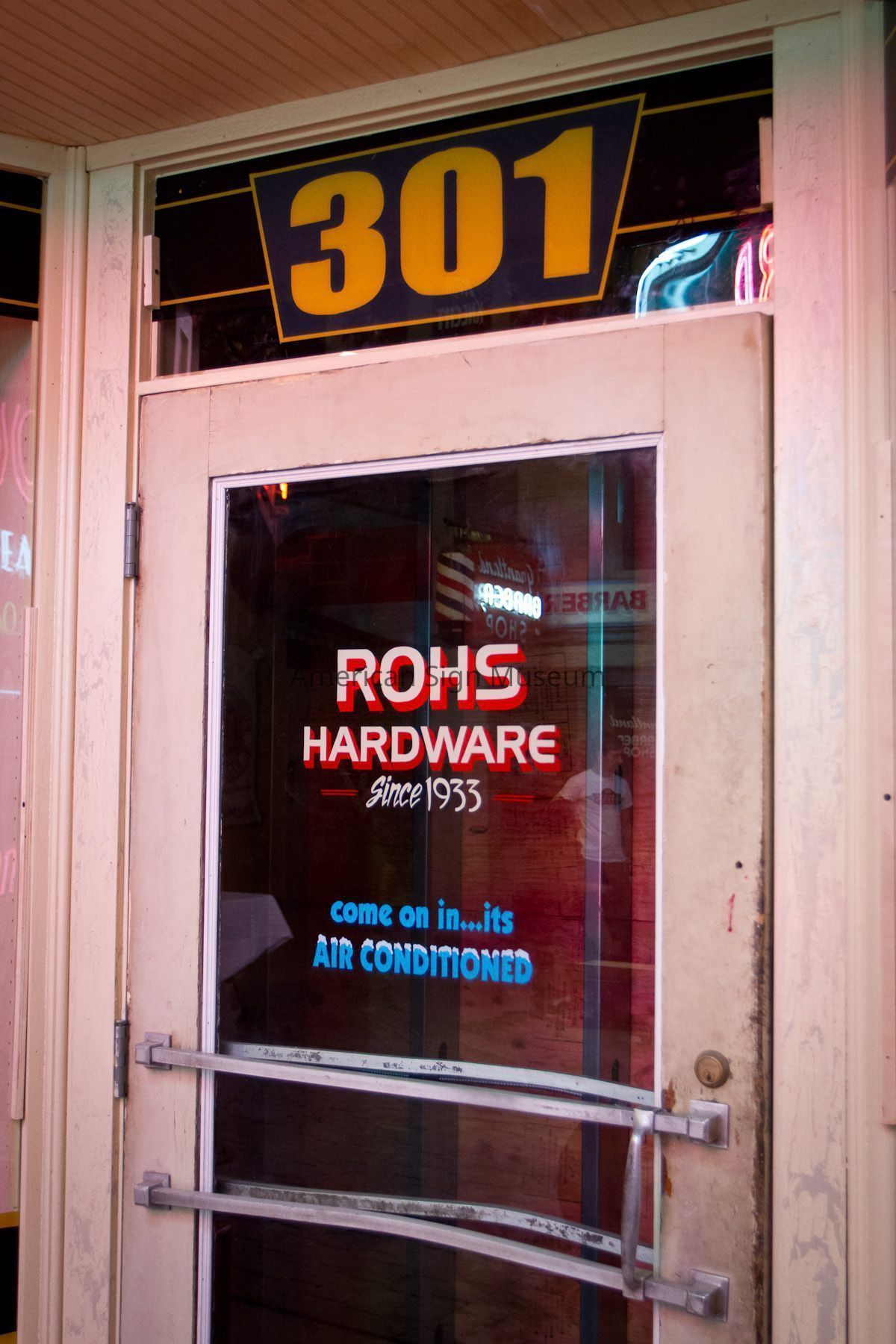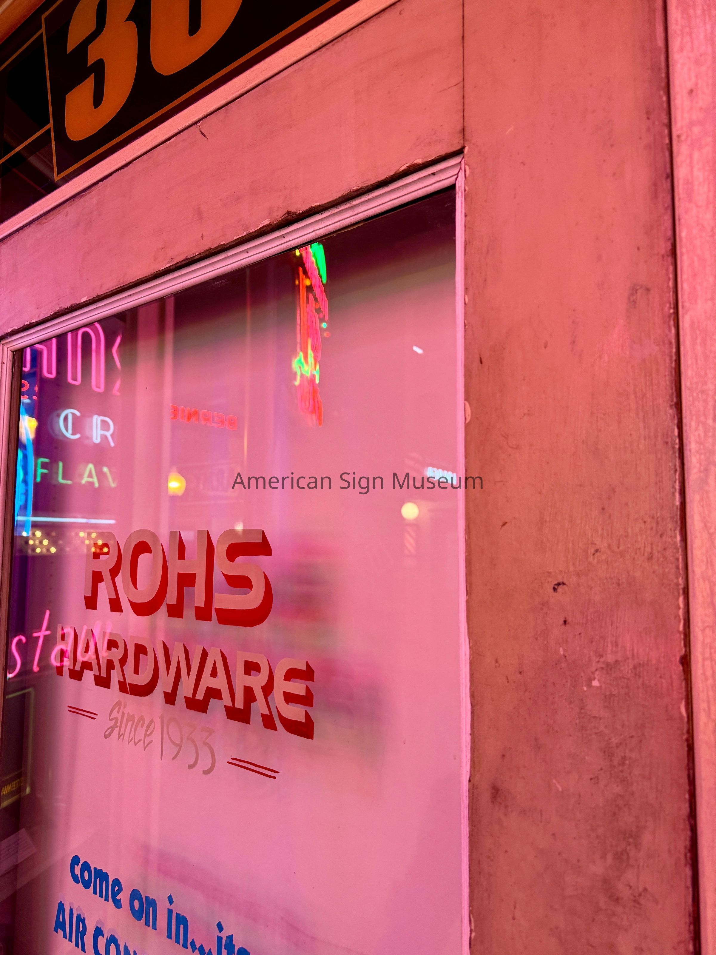 The museum originally inquired about acquiring just the “ROHS” neon-lit letters. Further conversations determined that, in fact, the entire storefront façade of porcelain enamel panels and other signs were scheduled to be removed and scrapped, prompting the museum to ask if they could have the entire façade. The new owners heartily approved and the entire façade was removed, panel-by-panel and re-installed on the museum’s Main Street.