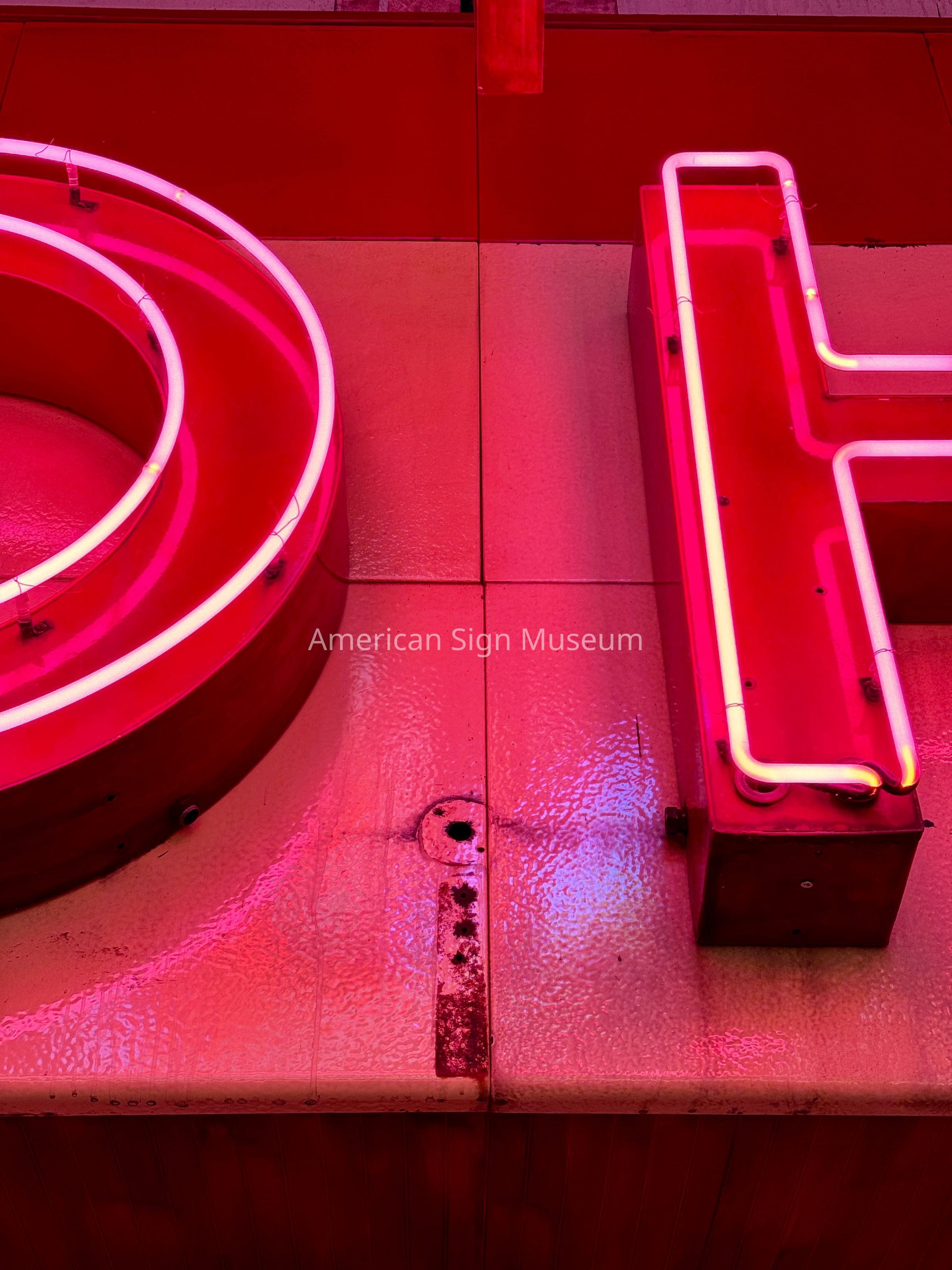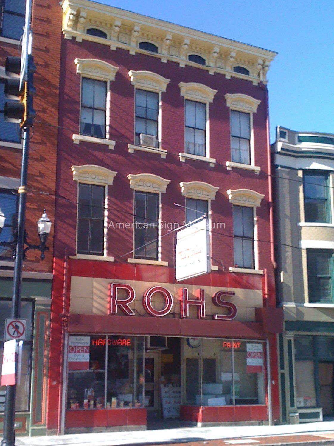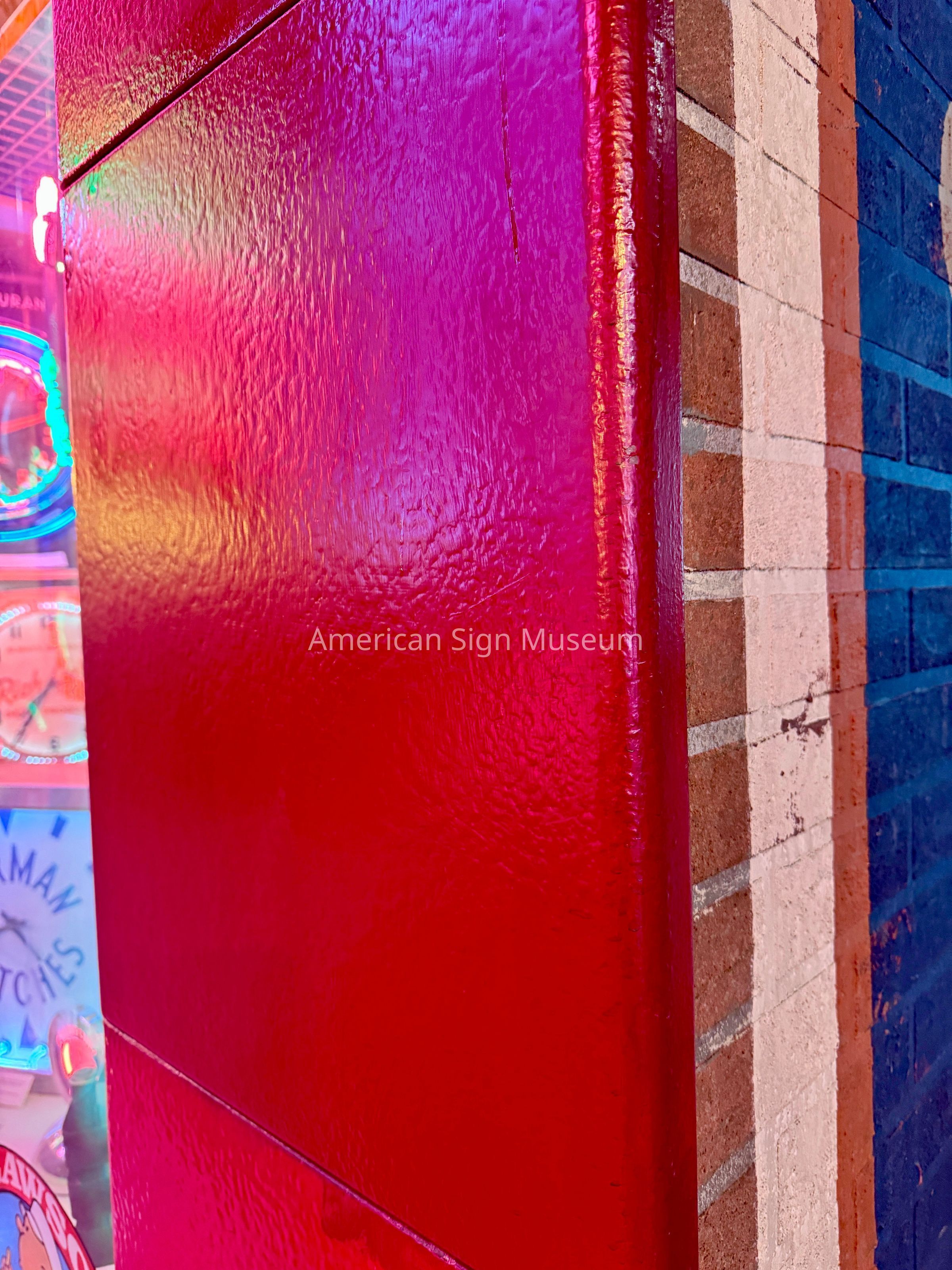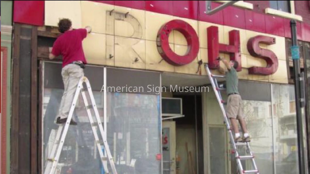 The museum originally inquired about acquiring just the “ROHS” neon-lit letters. Further conversations determined that, in fact, the entire storefront façade of porcelain enamel panels and other signs were scheduled to be removed and scrapped, prompting the museum to ask if they could have the entire façade. The new owners heartily approved and the entire façade was removed, panel-by-panel and re-installed on the museum’s Main Street.Collection