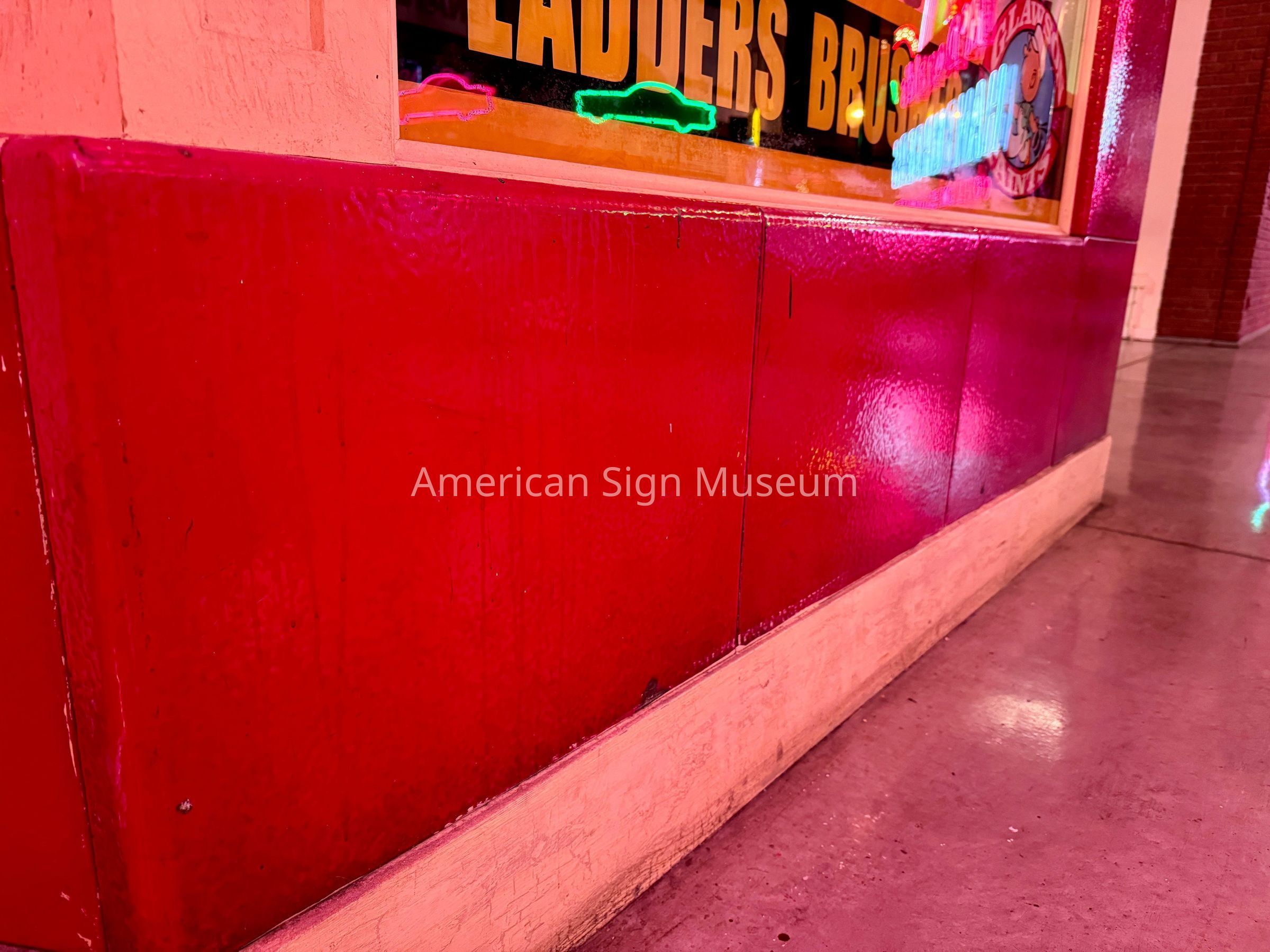 A collection of 52 total ( 16 cream, 36 dark red) porcelain enamel tiles, 6 wooden baseboard trim panels, and 7 wooden panel displays/sections, all original to the hardware store's facade. This collection was removed from teh store in approximately 2009 and reinstalled in 2012 at the Museum.