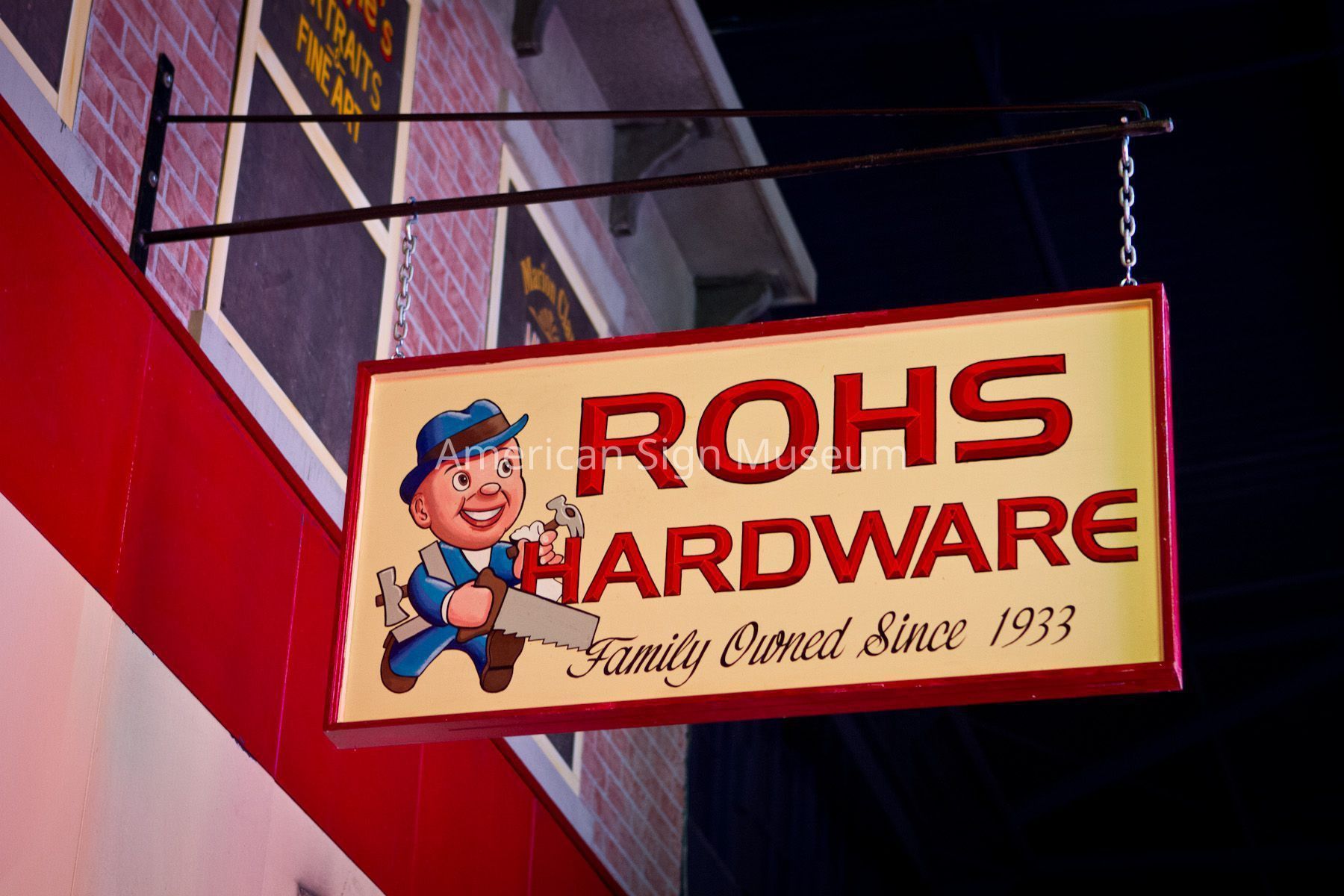 This wooden sign shows a character holding a saw and hammer, reads, "Rohs Hardware Family Owned since 1933," and is enclosed with a red border. It was created by Doc Welty and intended to be a 1940s-inspired mascot. Like many storefronts and signs on Main Street, it was created by one of the select group of sign-painters who contributed to the making of Main Street in 2012. It was inspired by the entire Rohs hardware storefront which is original from Cincinnati and not faux.