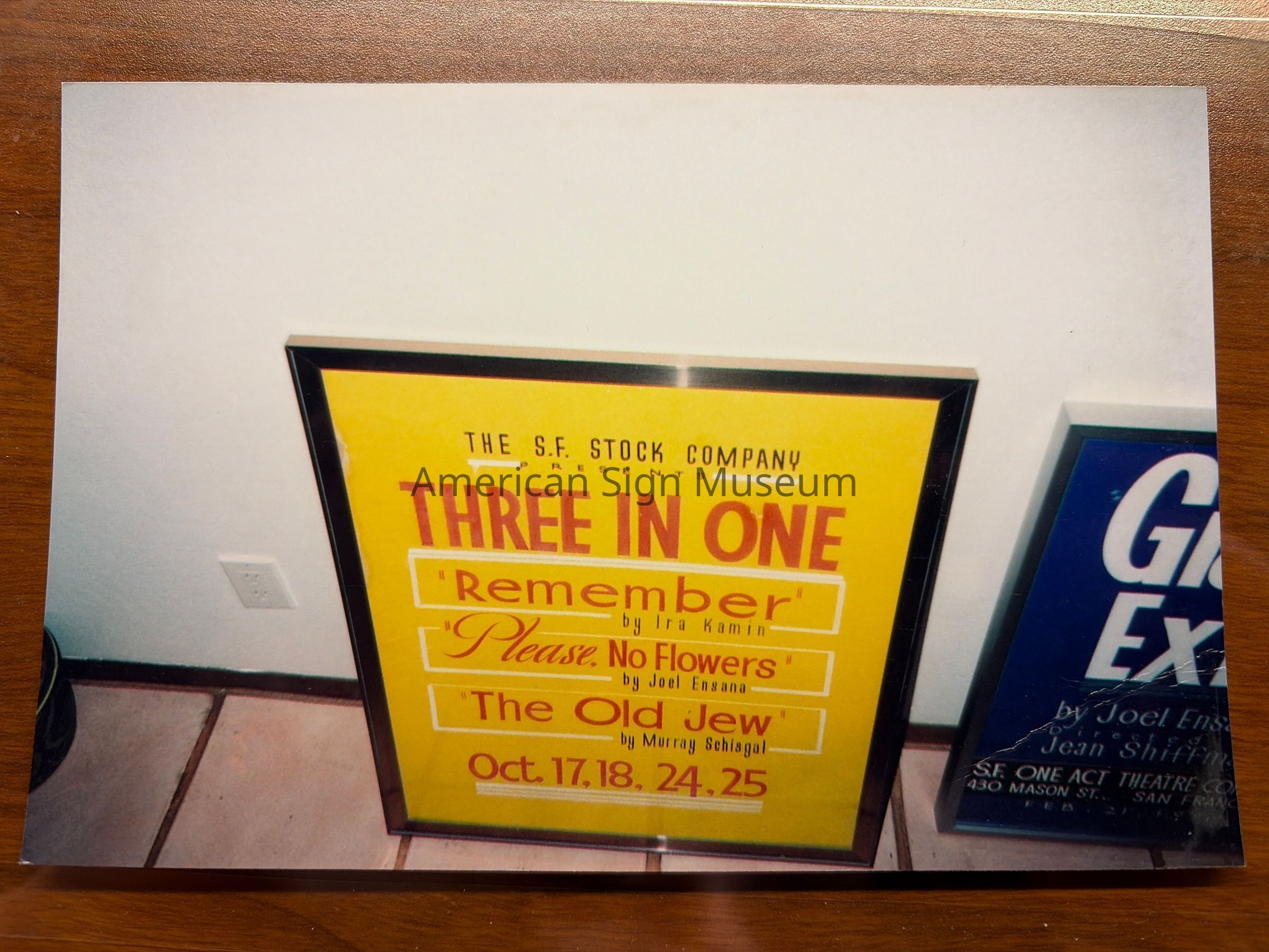 Color photograph of a show card reading "The S.F. Stock Company Presents Three In One 'Remember' by Ira Kamin 'Please, No Flowers' by Joel Ensana 'The Old Jew' by Murray Schiagal Oct. 17, 18, 24, 25". Made by Don SturdivantCollection