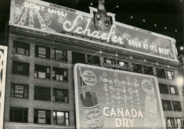 B&W photograph of Schaefer Beer and Canada Dry signs.