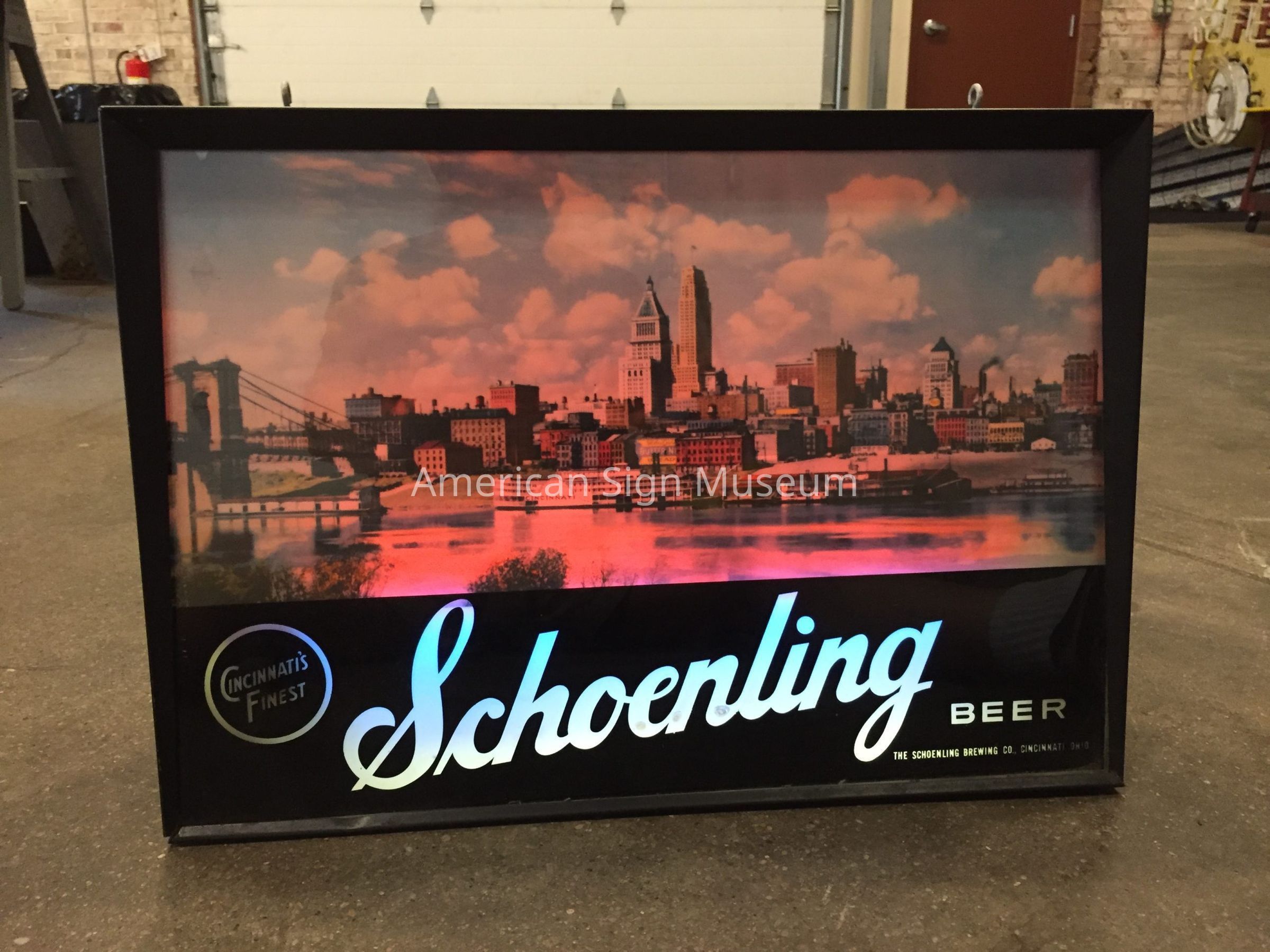 Schoenling Beer sign is internally illuminated, reverse screen-printed glass face in metal cabinet.