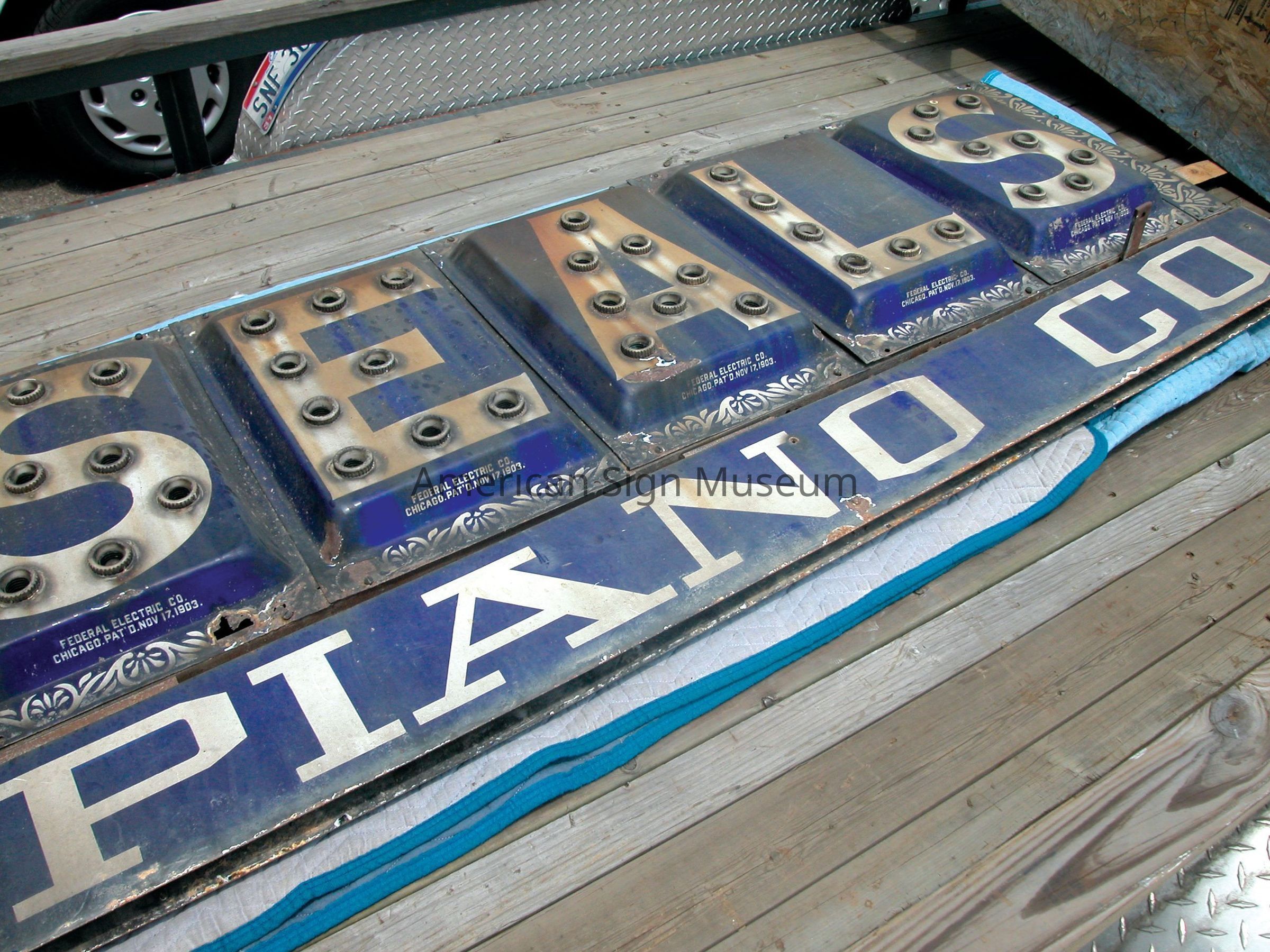 Double-faced lightbulb sign that reads, "Seals Piano Co." manufactured by Federal Electric sign company. It is composed of five stock, raised embossed porcelain enamel letter panels for, "SEALS," and a lower single porcelain panel below that is not illuminated. Its main color a rich ultramarine blue and the lettering is white. An Art Nouveau, tendril-like motif decorates the top and bottom of each of the 5 letter panels. At the bottom, in the center of each panel, there is a small inscription that reads, "Federal Electric Co. Chicago. Pat'd. Nov 17, 1903."Collection