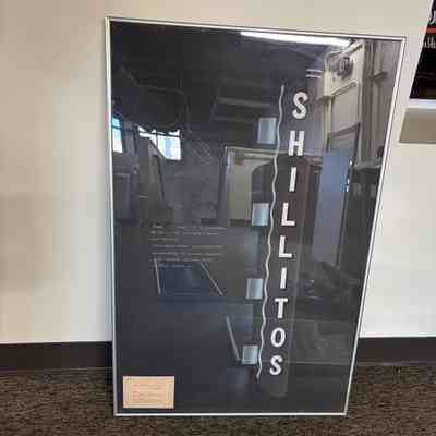 Sign, 63' high 8'-6" projection; 48" All Lucite Letters, faces; and return. ; Stainless Steel brackets and; serpentine recessed channel; with 18mm Yellow Gold; tubing therein.Material/Technique