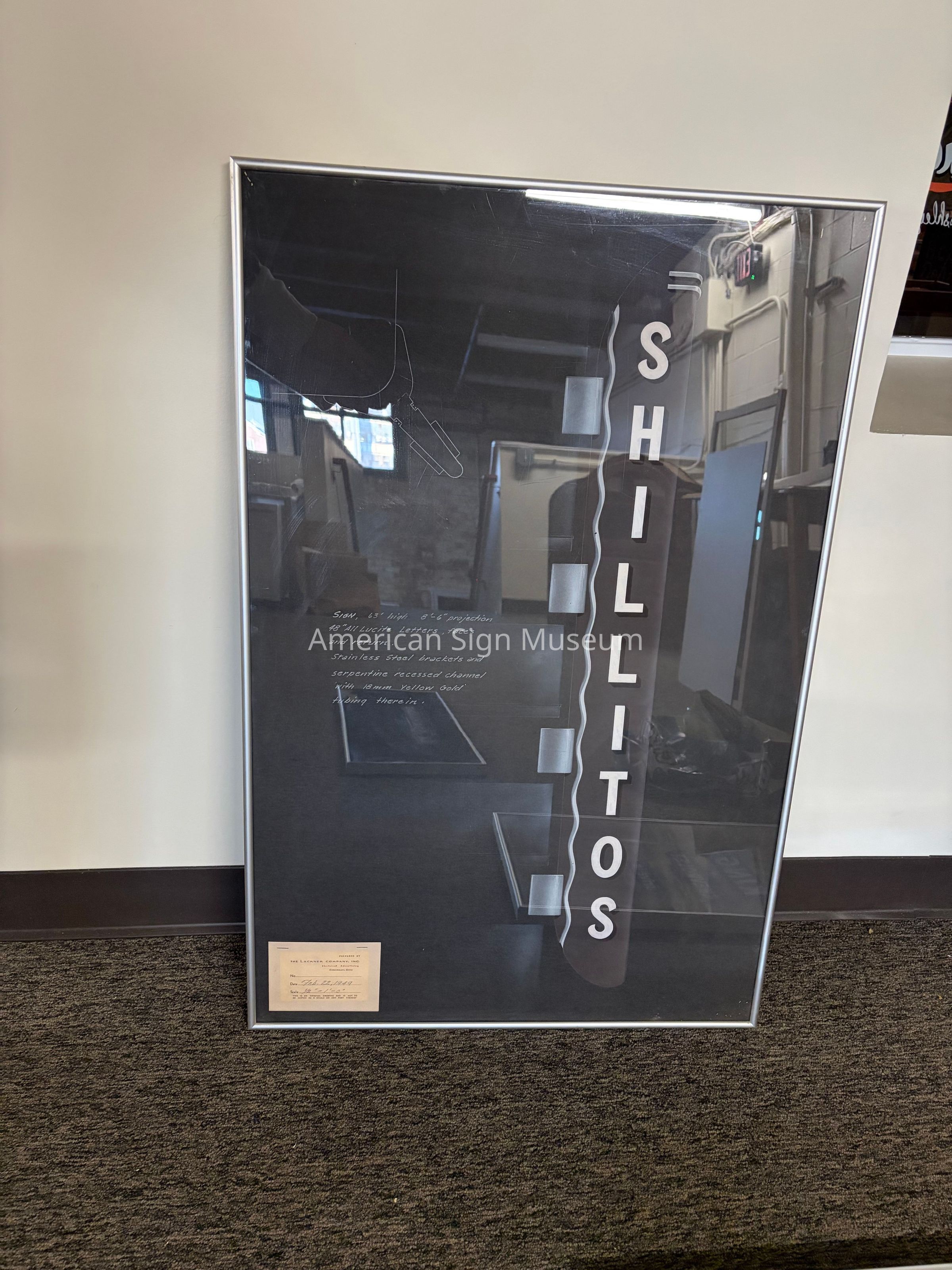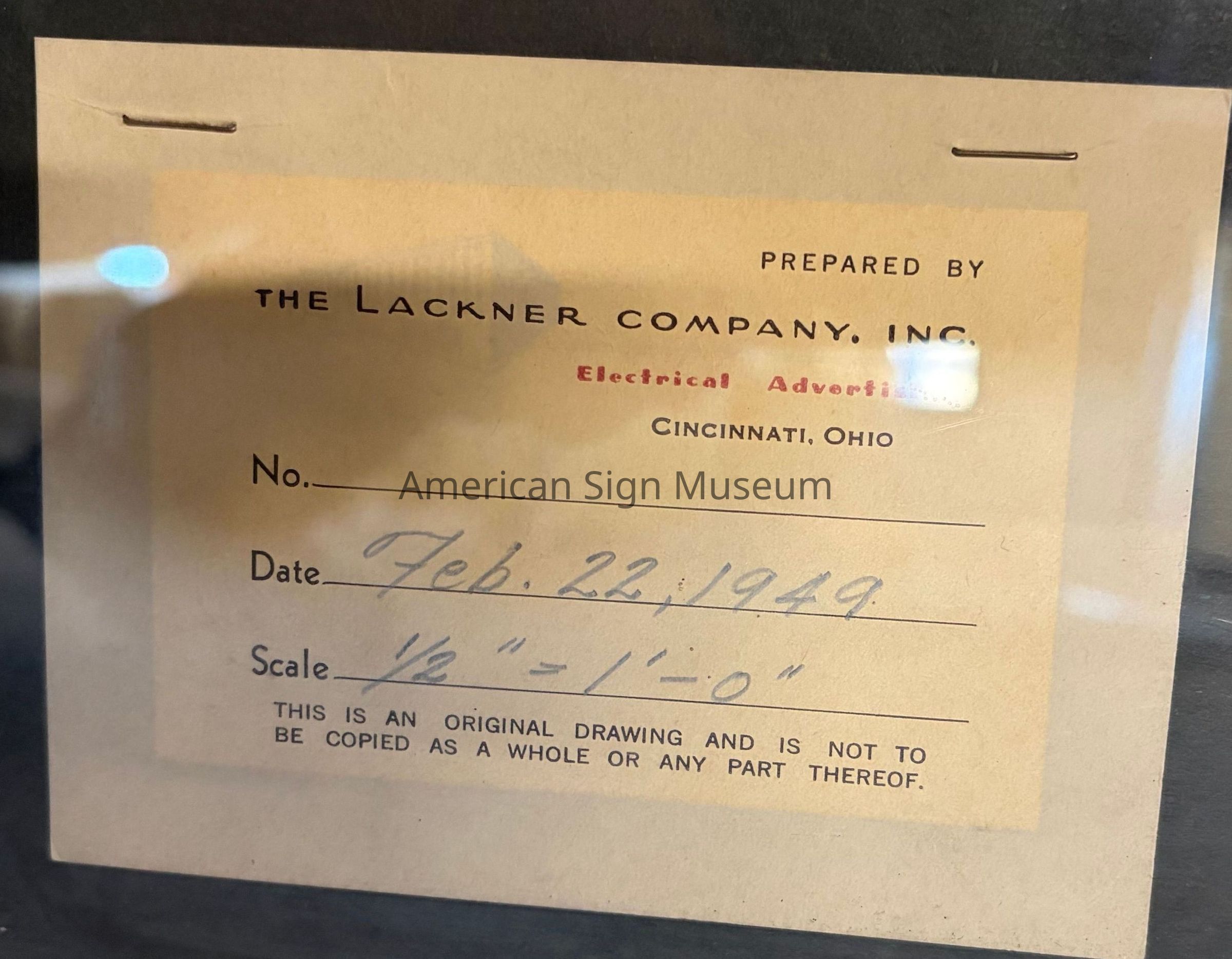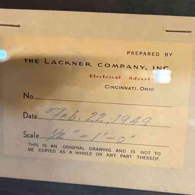 Prepared by; The Lackner Company, Inc; Electrical Advertising; Cincinnati, Ohio; No.; Date Feb. 22, 1949; Scale 1/2" = 1' - 0"; This is an Original Drawing and Is Not To Be Copied As A Whole or Any Part Thereof.Material/Technique