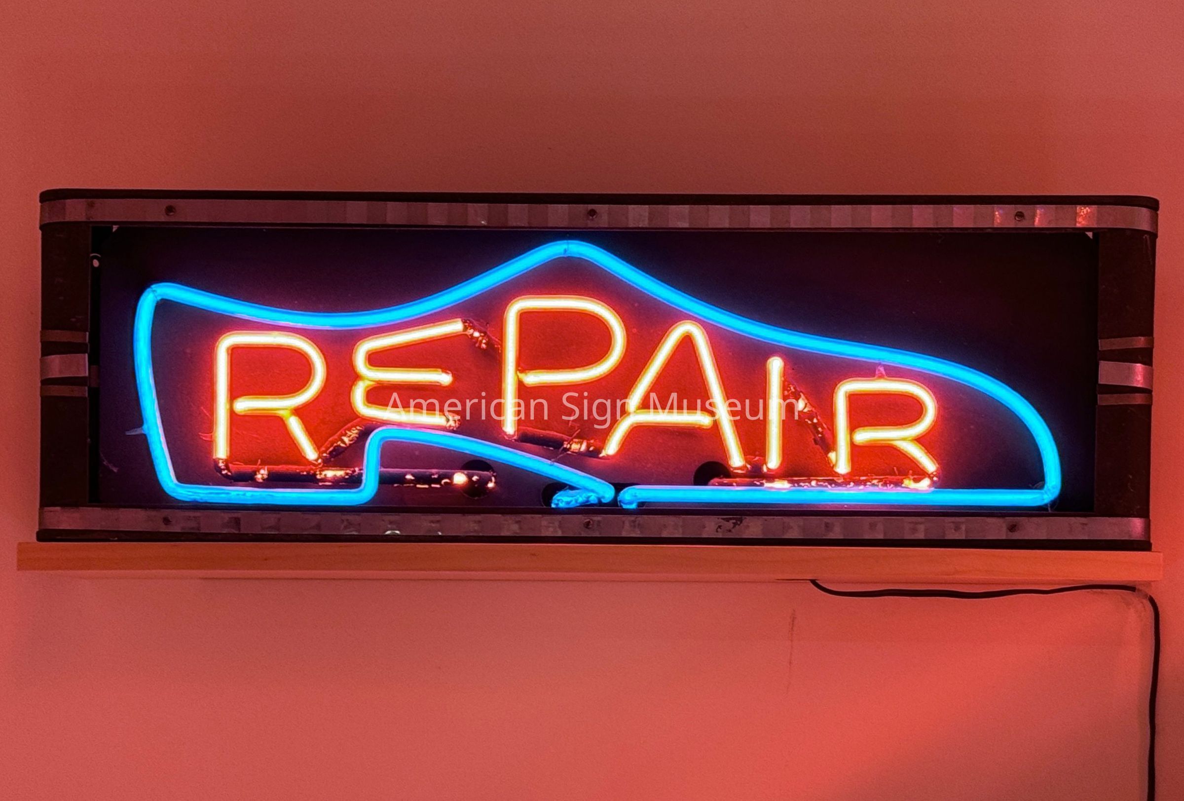 Small, point-of-purchase neon sign that reads, "REPAIR," and is shaped like a shoe.Collection