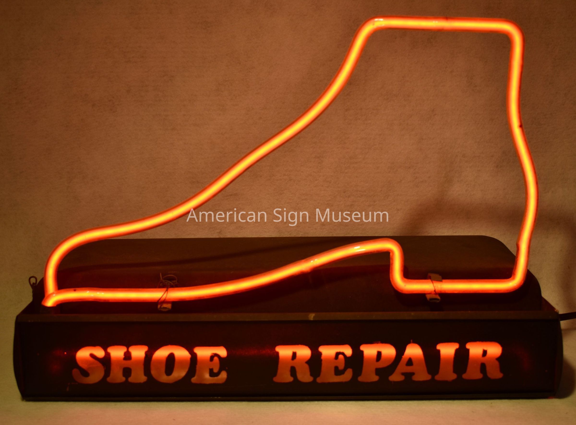 Countertop skeleton neon of shoe mounted on cabinet reading "Shoe Repair."Collection