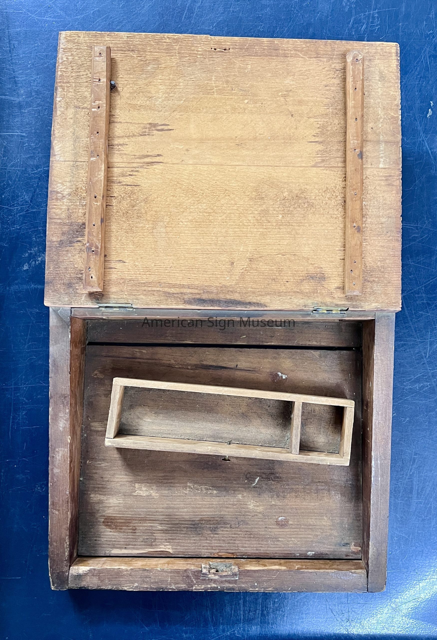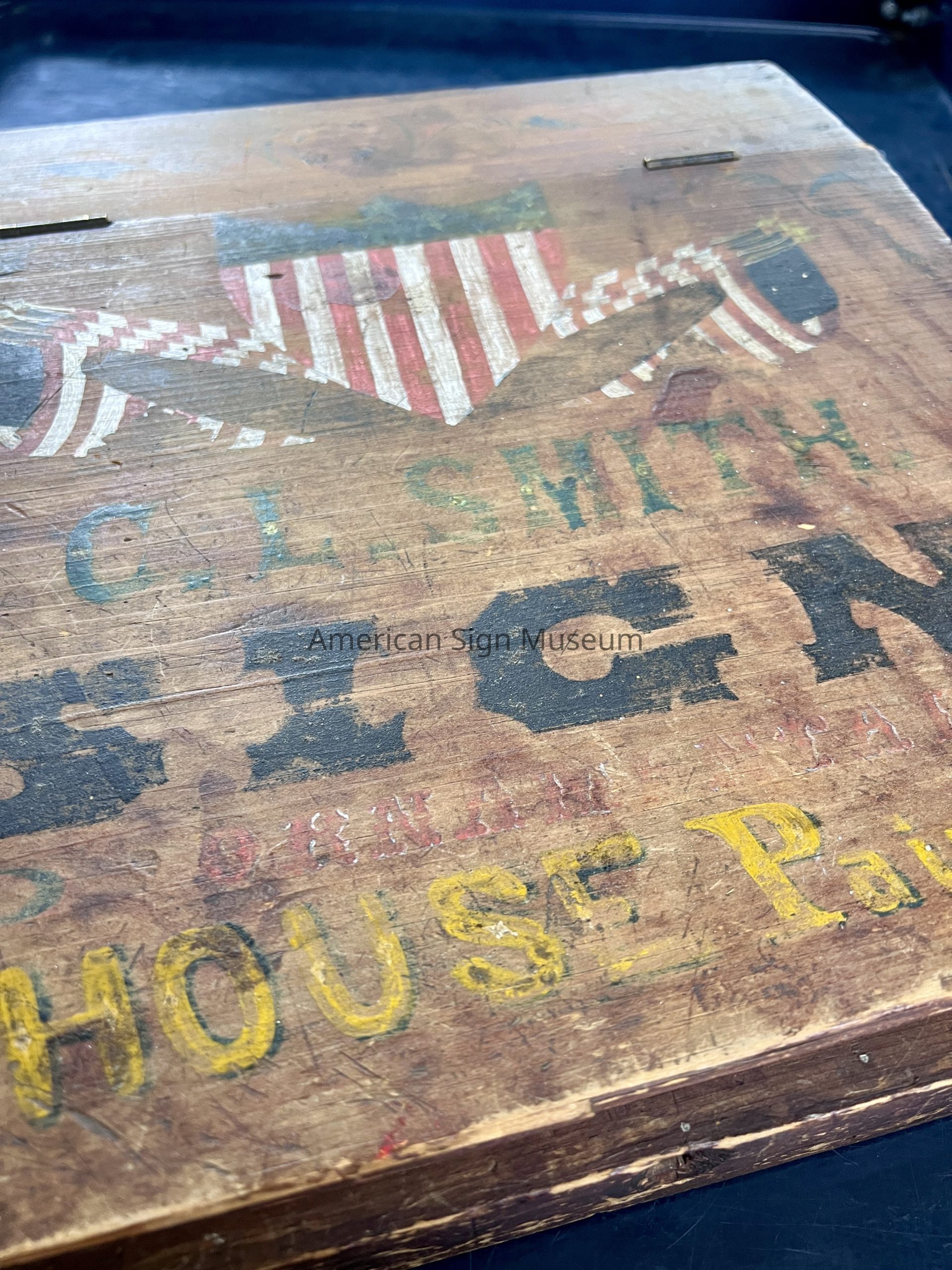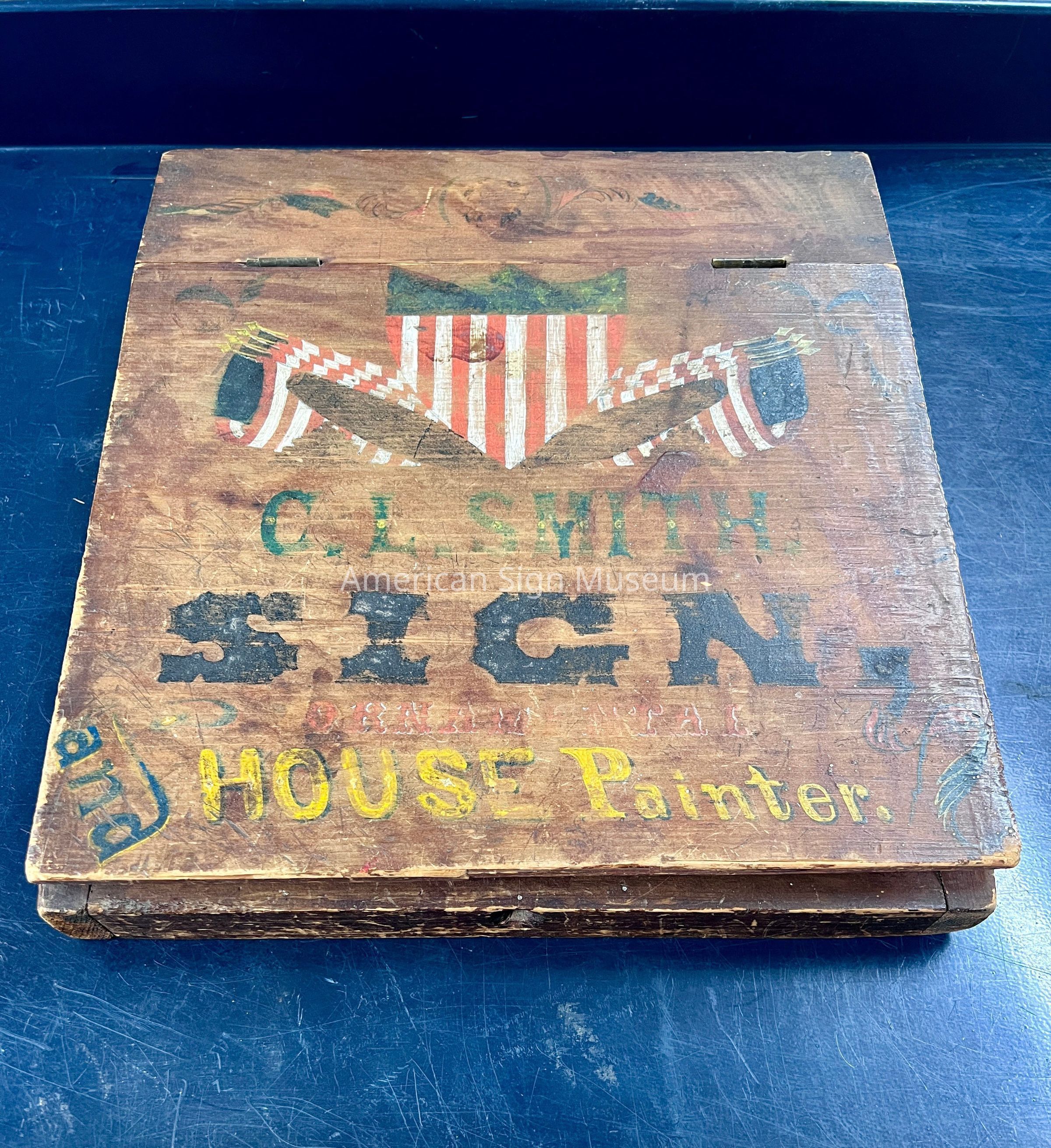 Sign kit/sign painter's box belonged to sign and house painter C.L. Smith, was intended to sit on top of a table and hold select materials or supplies. It is trapezoidal-shaped, made of hand-painted wood and features a top lid that opens via two metal inset hinges. The painted texts features various colors and styles, and reads, "C.L. Smith"," Sign and House Painter," and, "Ornamental." It also features a centralized badge and flag motif.Use