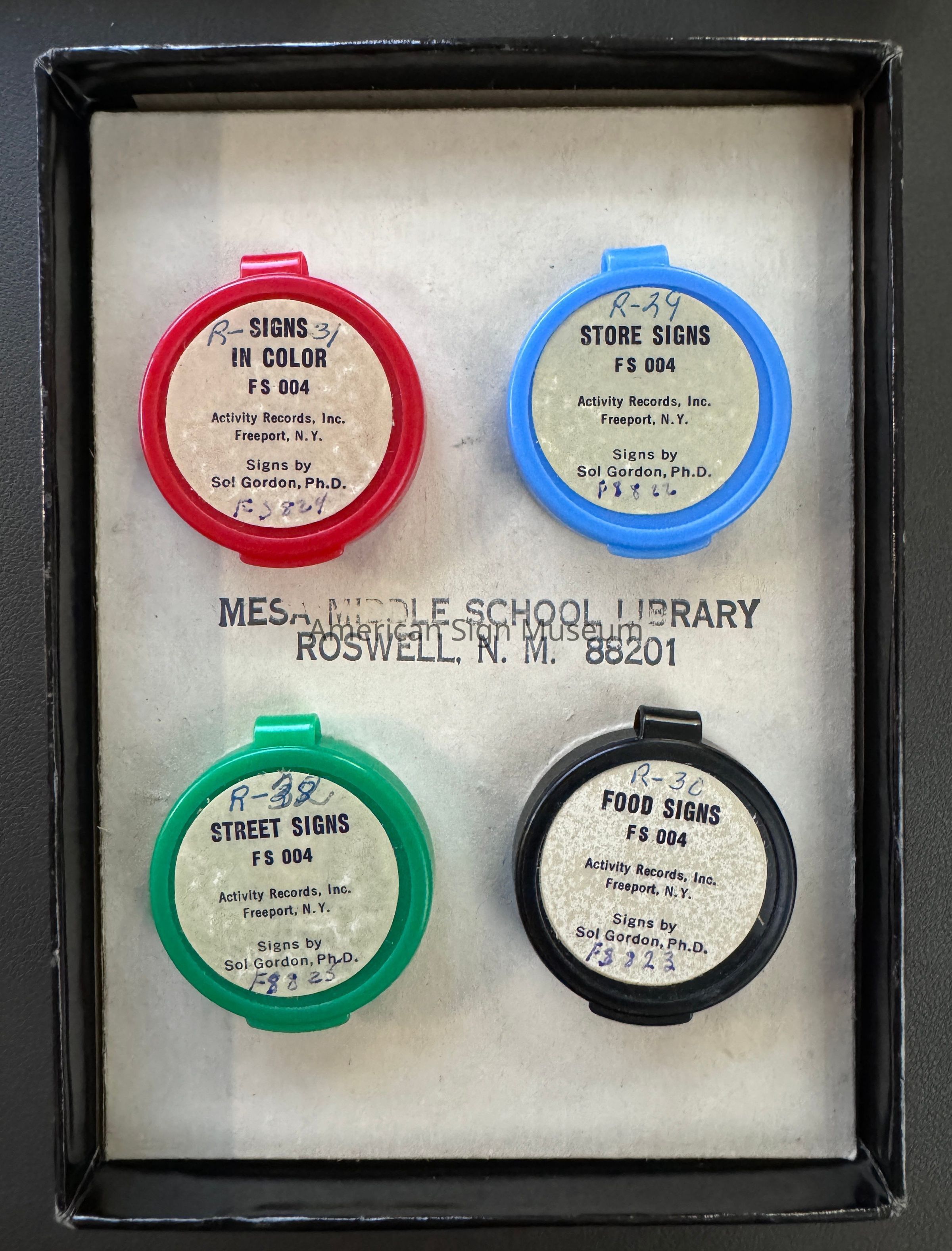 A small collection of 4 film strips inside of a box that reads, "Signs by Sol Gordon, PhD." These were produced by Bear Films, Baldwin, NY. There is also an eight-page booklet in box describing the four films--"Store Signs," "Food Signs," "Street Signs" and "Signs in Color"--reads, "A Teacher's Guide for Signs."Collection