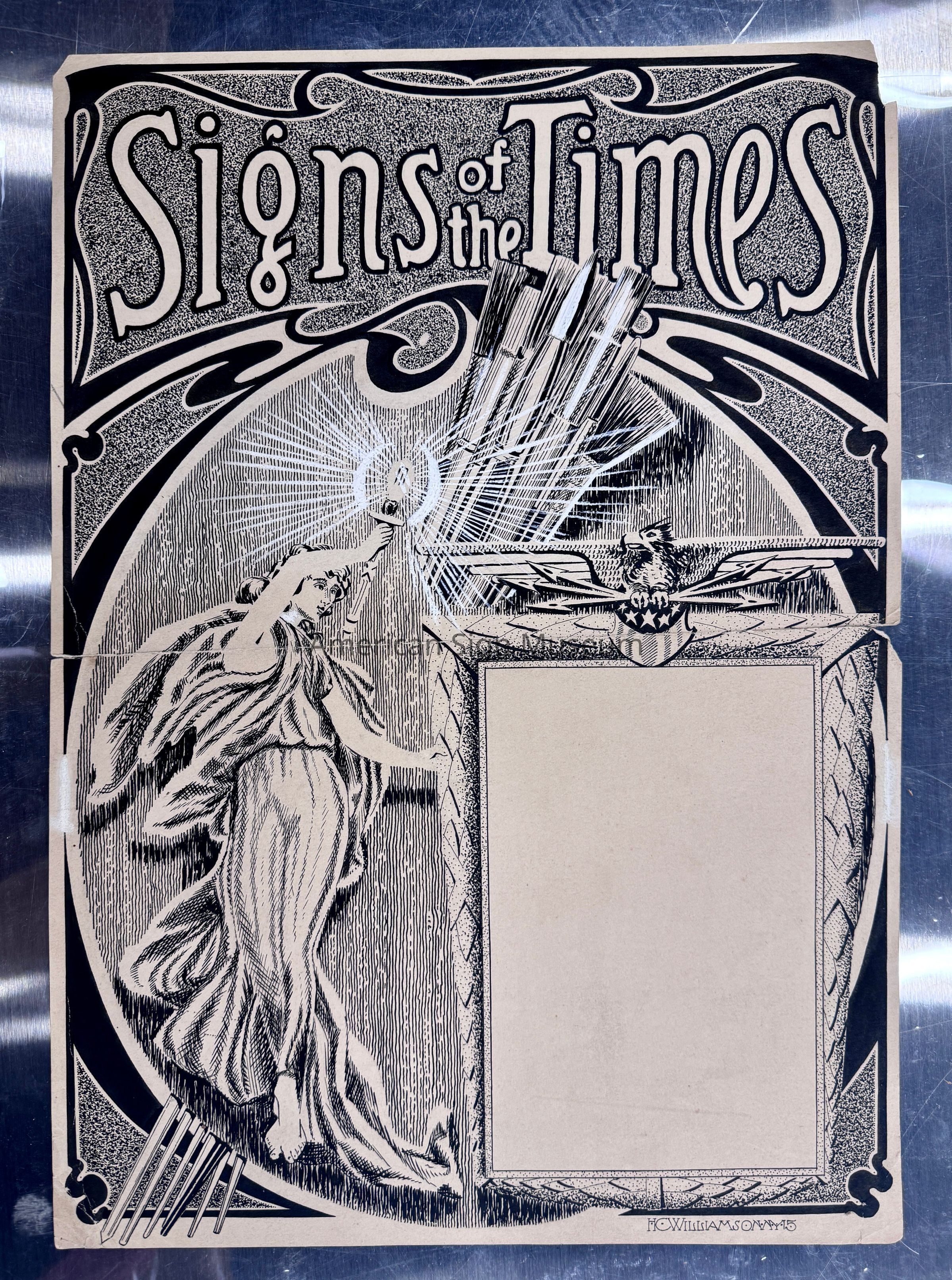 Pen and ink illustration by H.C. Williamson created as an alternate proposal for a Signs of the Times cover in 1915.Collection