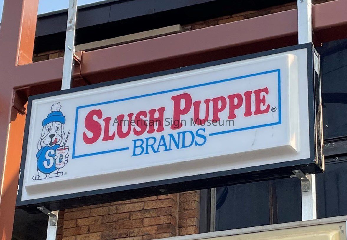 An internally illuminated, plastic sign for Slush Puppie Brands. A refreshing slush beverage, Slush Puppie got its start here in Cincinnati in 1970. The sign dates from the 1970s and features a single side of plastic.Collection