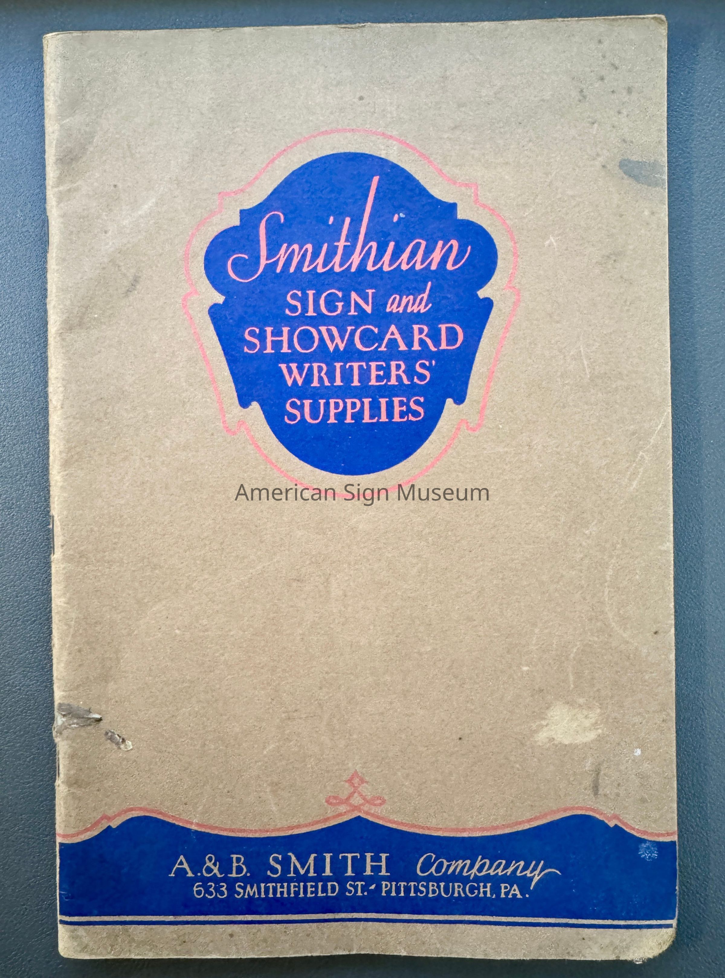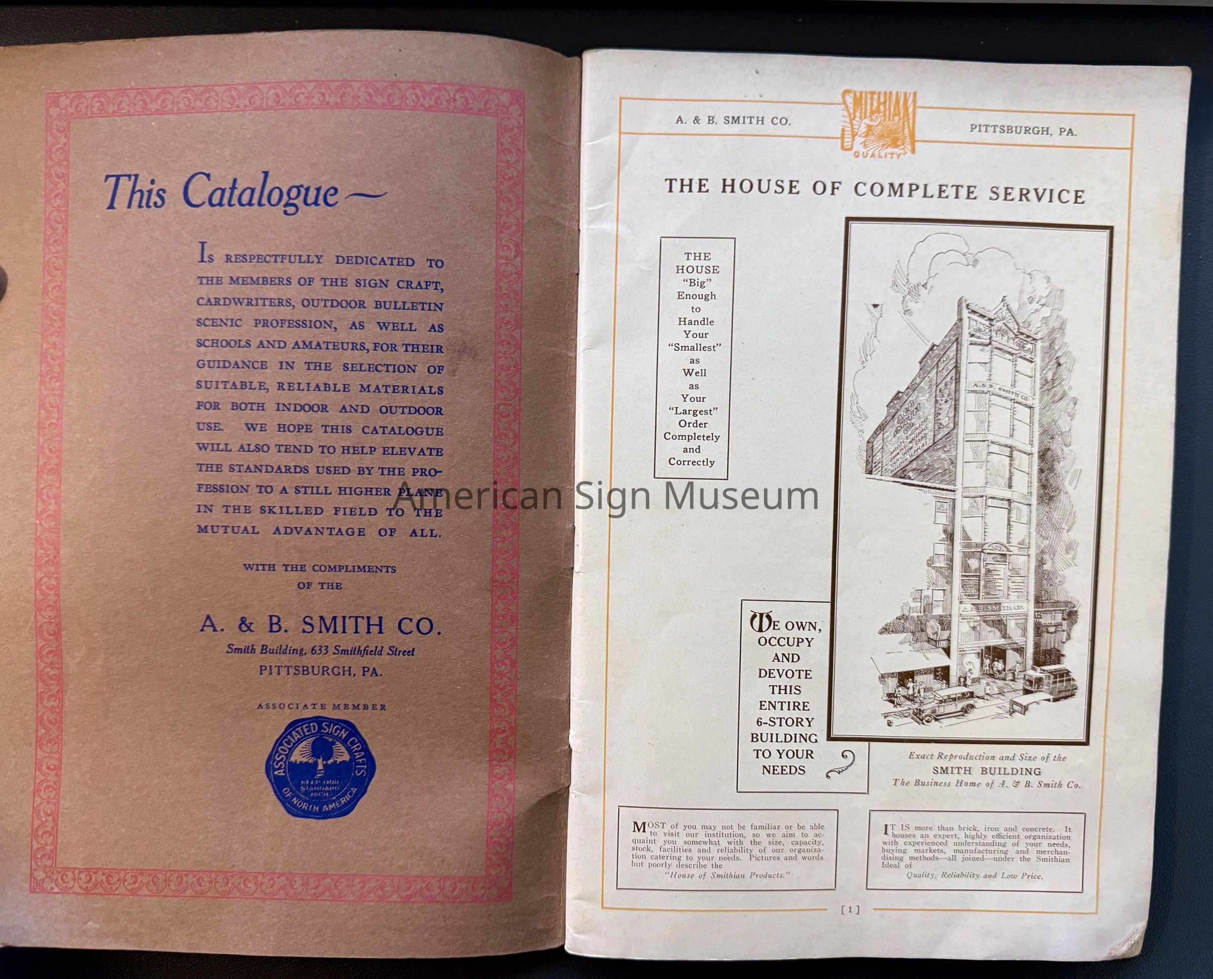 A. & B. Smith was an advertising and graphics company based in Pittsburg, PA. It's headquarters were at 633 Smithfield Street. This catalogue details their ordering process for sign-making supplies such as showcard colors by Weber, Red Sable Brushes, and Hastings gold leaf packets. It has 80 pages and an index in the back.Collection