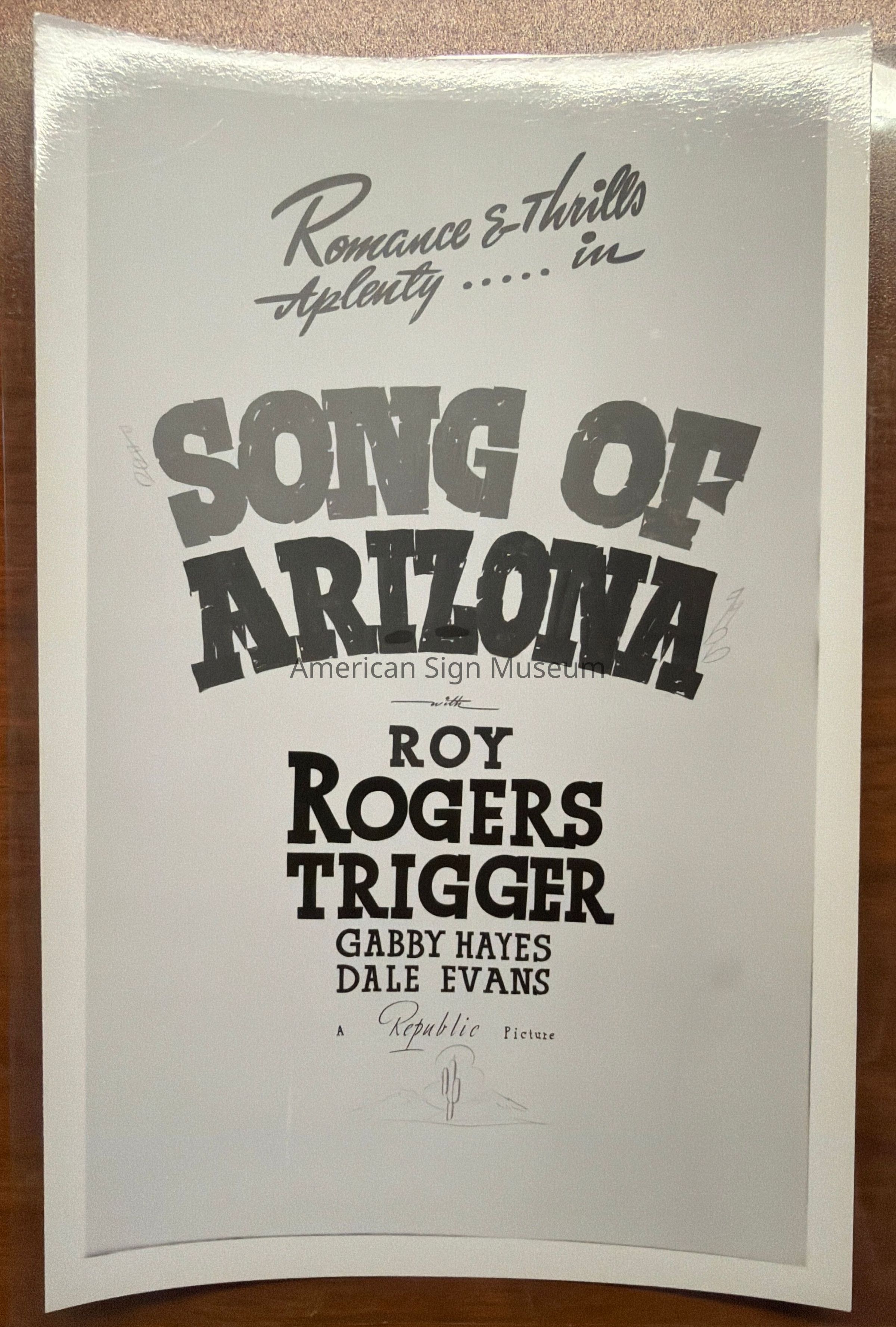 Black and white photograph of a show card reading "Romance & Thrills Aplenty ..... in Song of Arizona with Roy Rodgers Trigger Gabby Hayes Dale Evans A Republic Picture". Made by Don SturdivantCollection