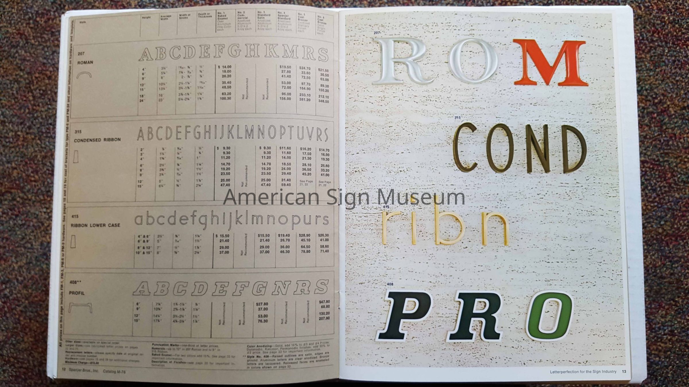 Catalog with metal letters, plaques and exterior signs with standard sizes and prices. Printed in color.