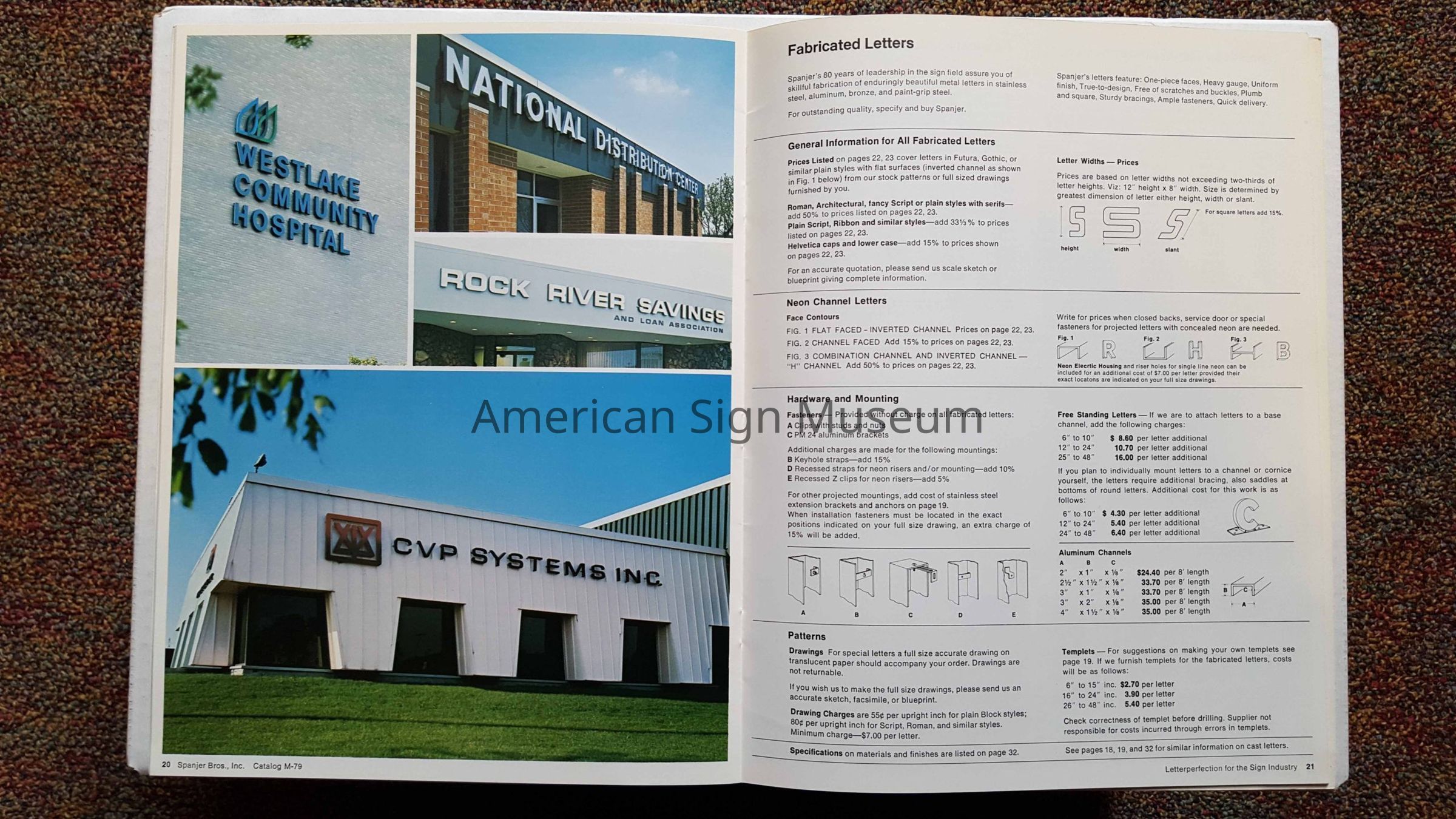 Catalog with metal letters, plaques and exterior signs with standard dimensions and prices. Printed in color.