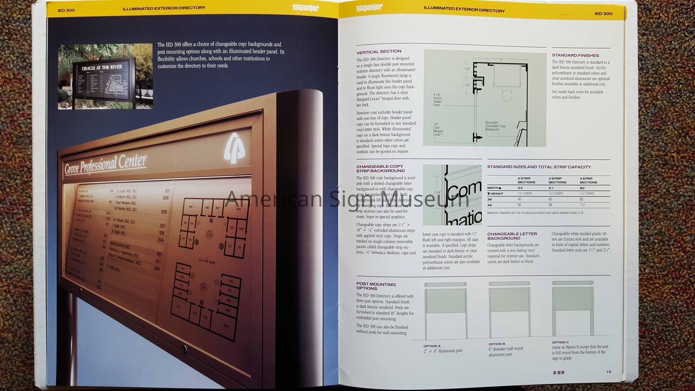 Catalog of standard interior and exterior directory systems offered by Spanjer. Printed in color. Attached inside is a price list printed in black and white.