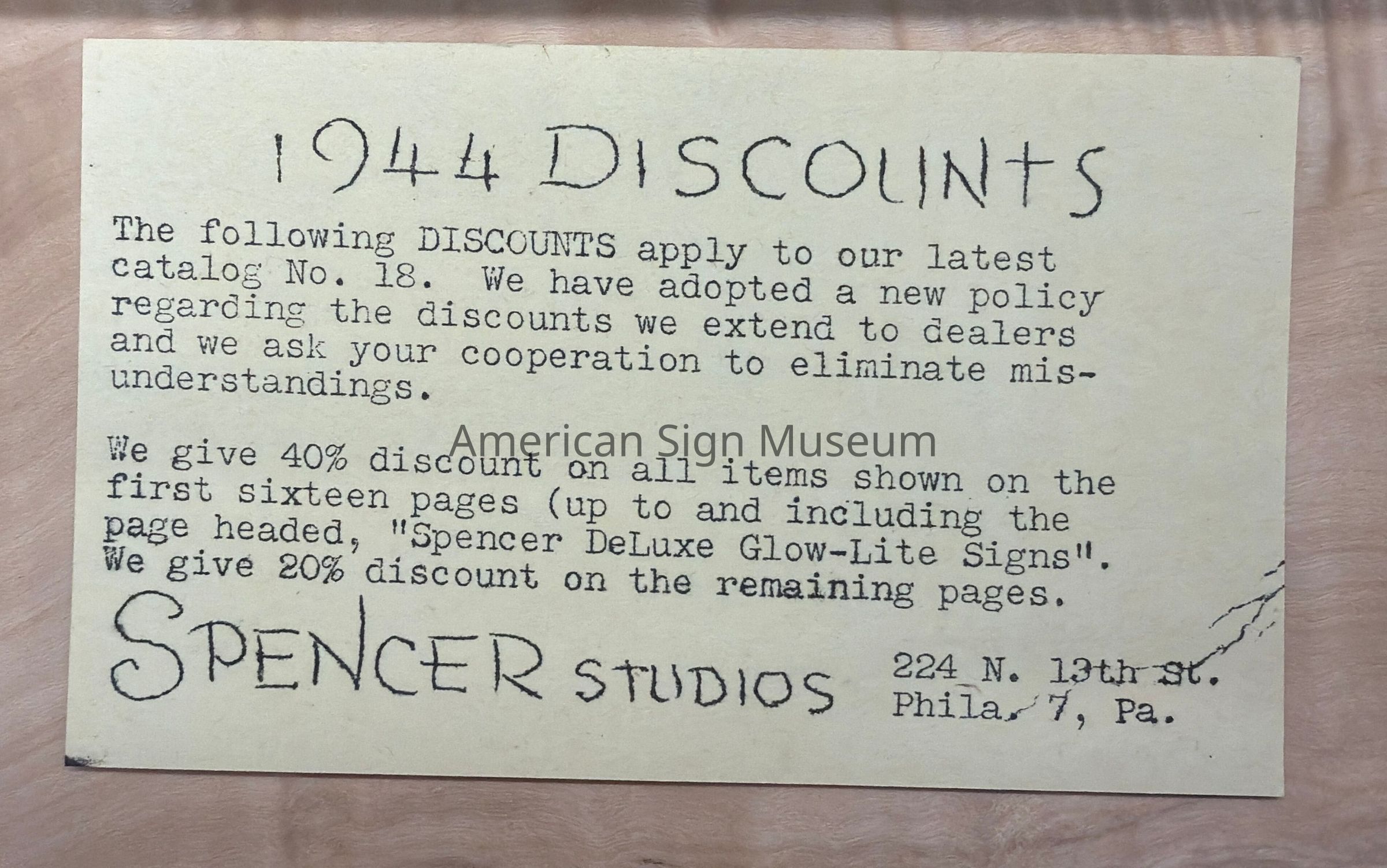 Spencer Studios Sign CatalogueEntry/Object ID