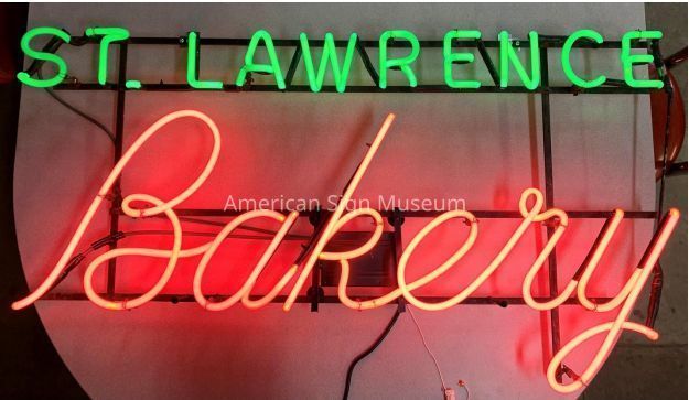 A neon skeleton sign that has two levels of text. The top is in green, caps lettering and reads, "St. Lawrence." The bottom is in red script and reads, "Bakery."Collection