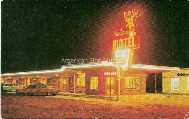Double-faced, painted metal Stag Motel sign. Stag Motel was located in Beaver, UT. Sign came from the famous boneyard of YESCO's Las Vegas plant.Collection
