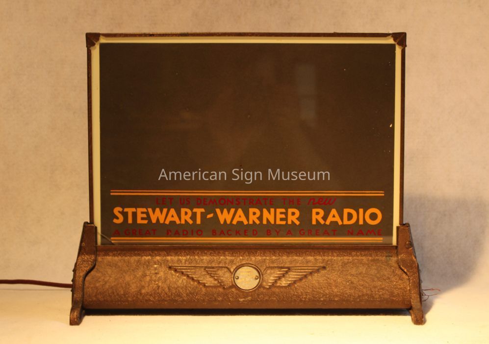 "Stewart-Warner Radio" double-faced glass point-of-purchase sign is designed for erasable grease pencil copy. Glass faces are mounted on metal base with embossed Stewart-Warner logo and edge-lit with incandescent bulbs.Collection