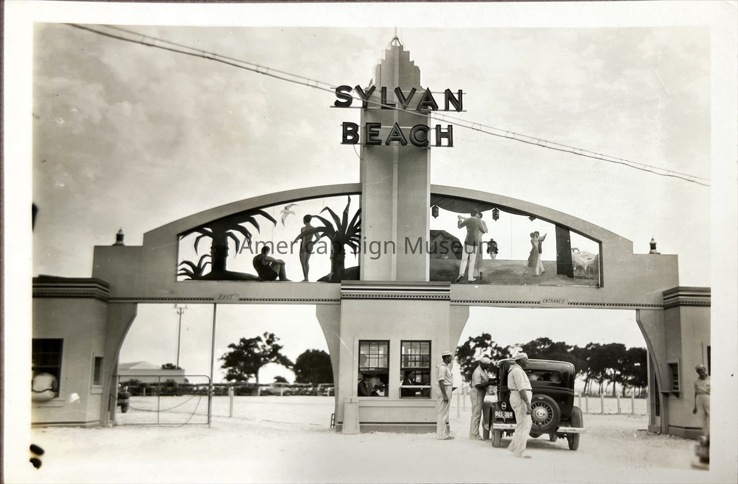 B&W photograph of early neon sign 1930-1940s with figures - Sylvan Beach.