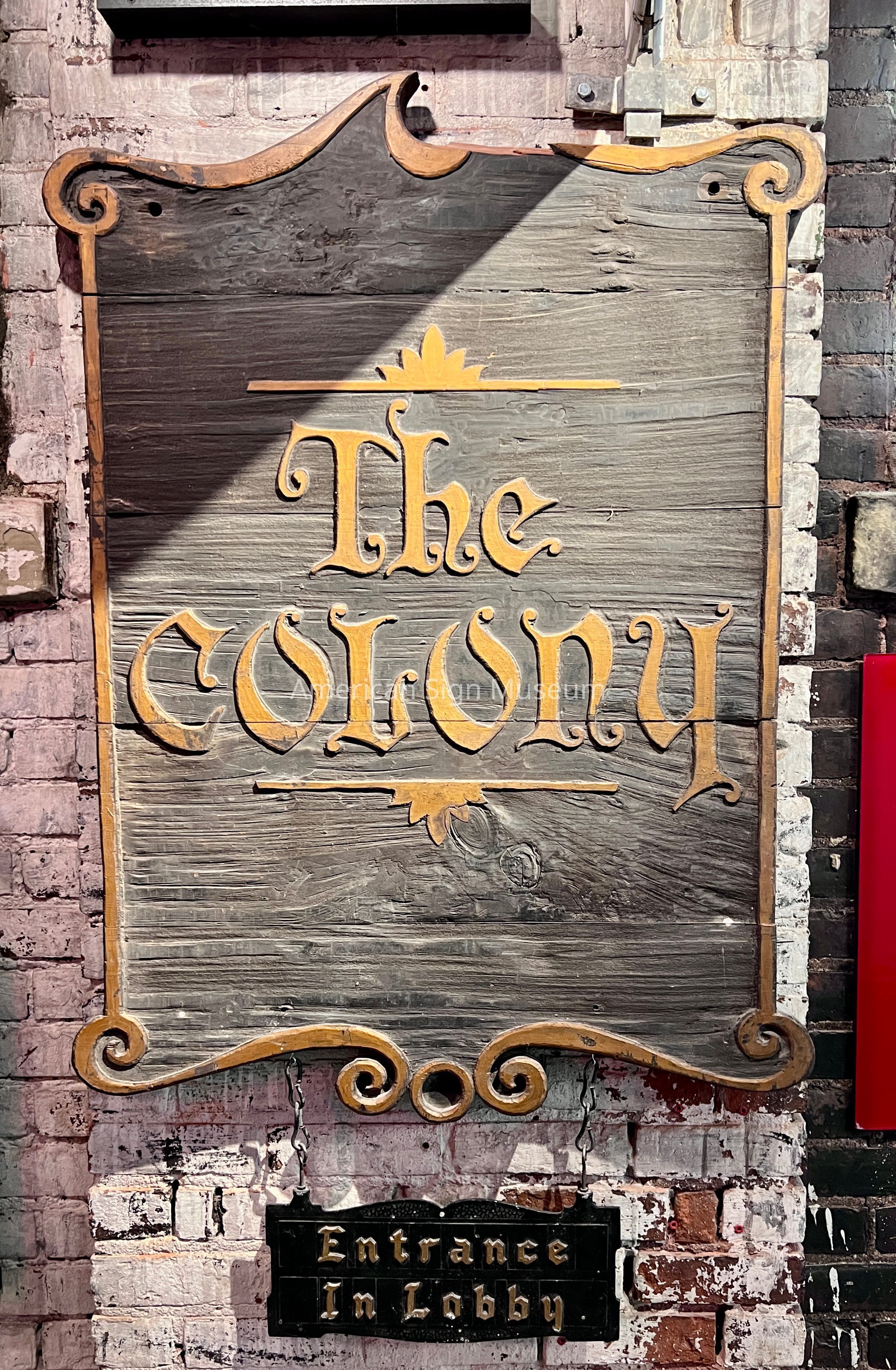 From about 1970, this sign used to hang on a restaurant on Walnut Street in downtown Cincinnati. When the restaurant closed, the new owners of the building it had been found the sign and donated it to the Museum. The sign is reminiscent of the tradition of colonial tavern signs which were usually quite simple in design, stating only the establishment's name and a modest symbol or icon. This sign is made from wood but has a decorative gold border. It states The Colony and it has a small panel hanging below the main face that states "Entrance in Lobby".Collection