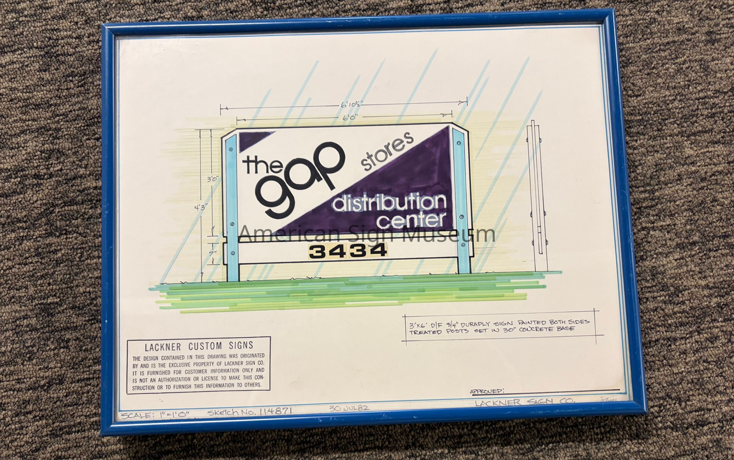 Hand-rendered, ink sign sketch for the gap stores distribution center by the Lackner Sign Company.Collection