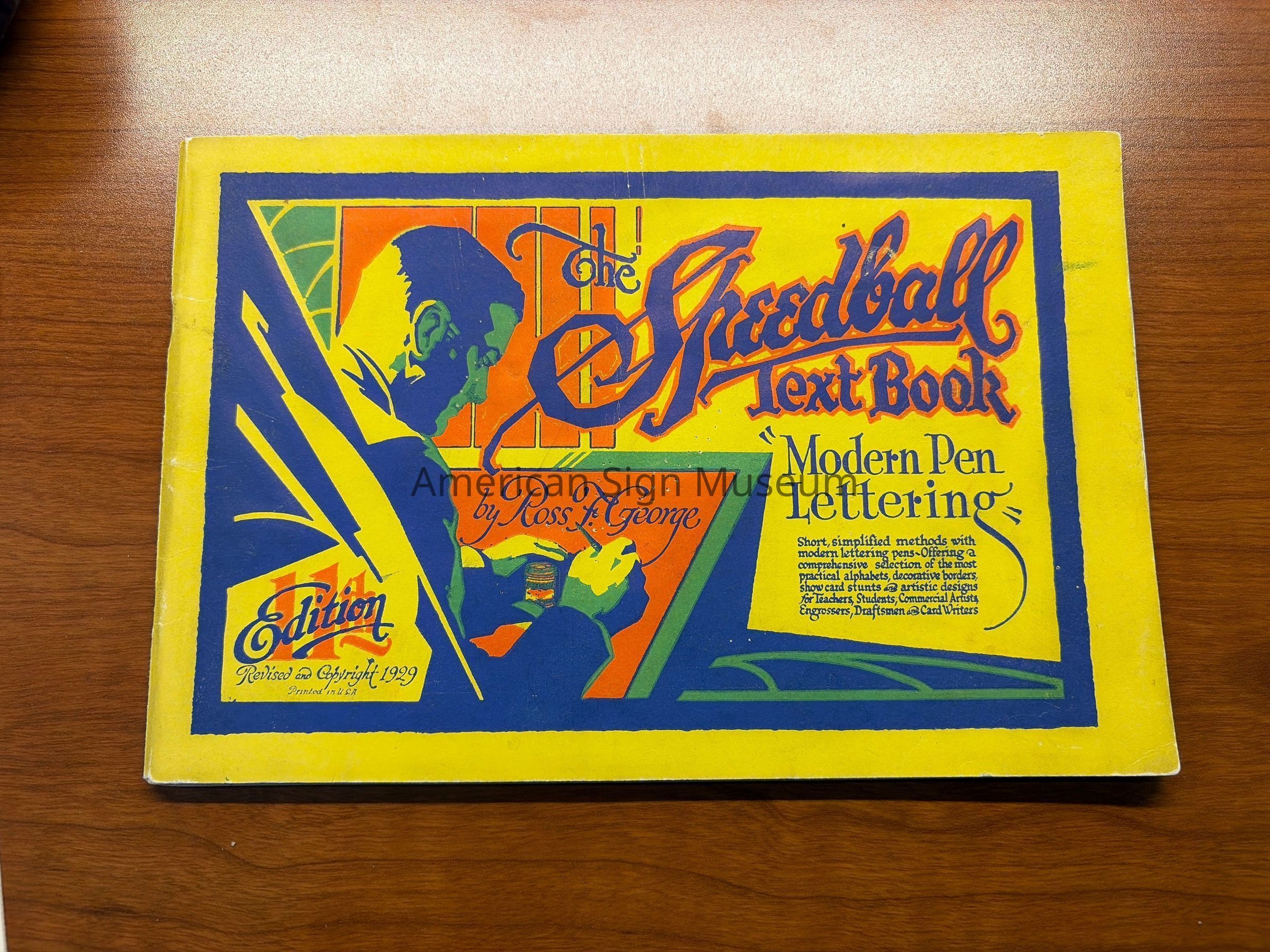 The Speedball Textbook by Ross F. George contains multiple examples and guides for lettering with Speedball pens. It is a yellow, orange, and blue colored booklet.Collection