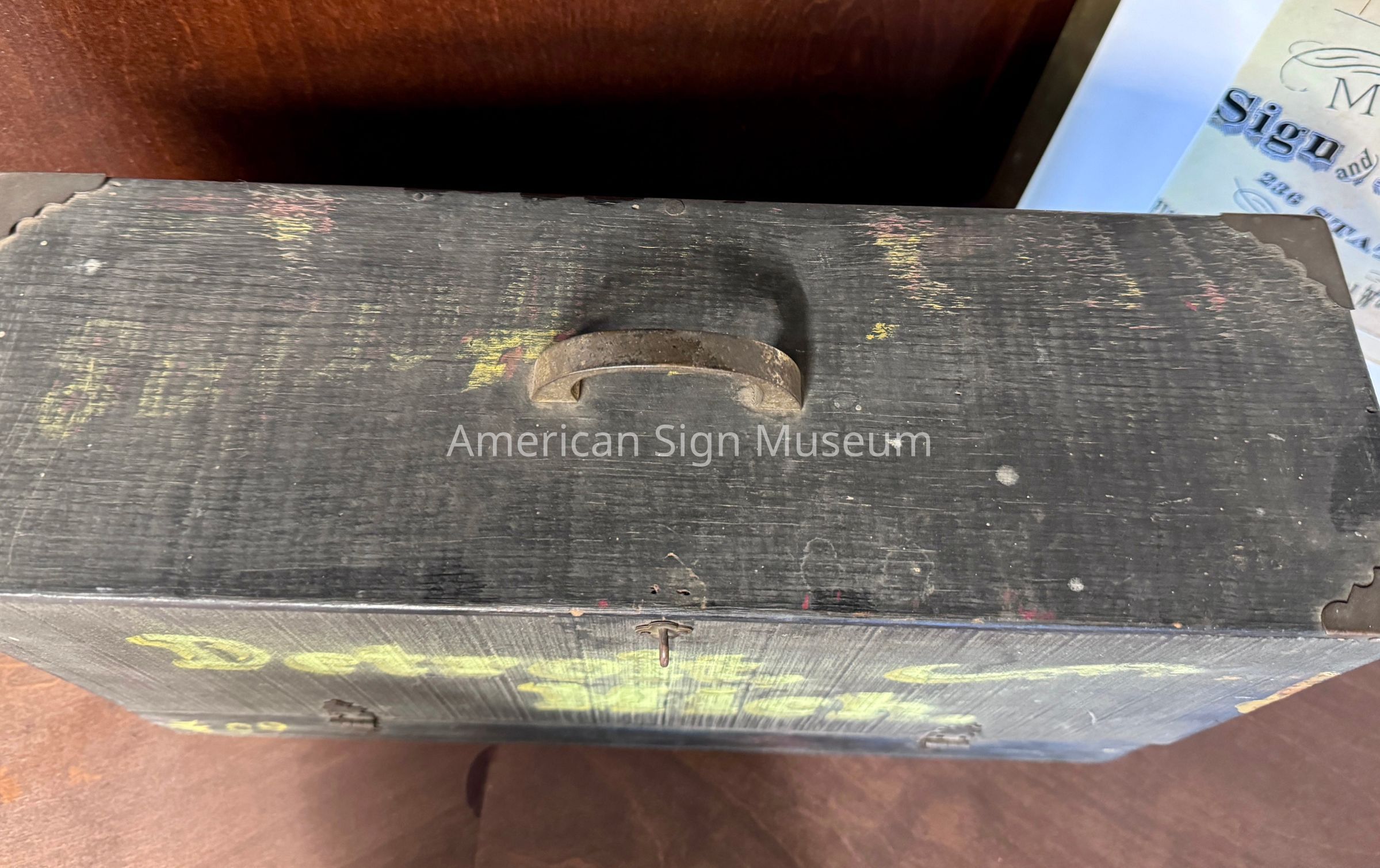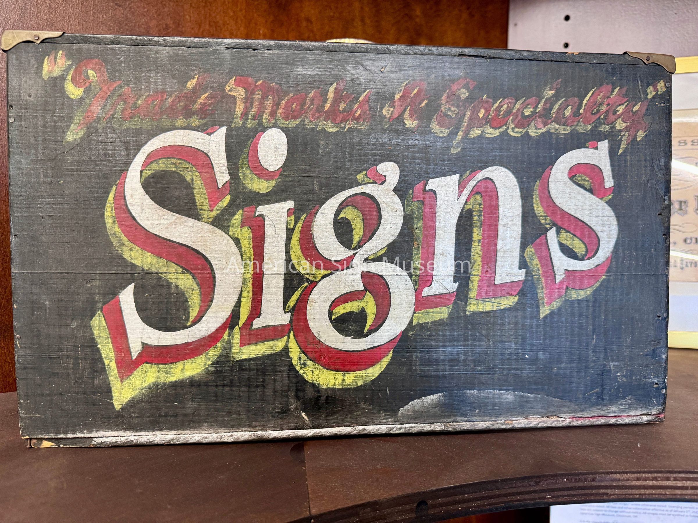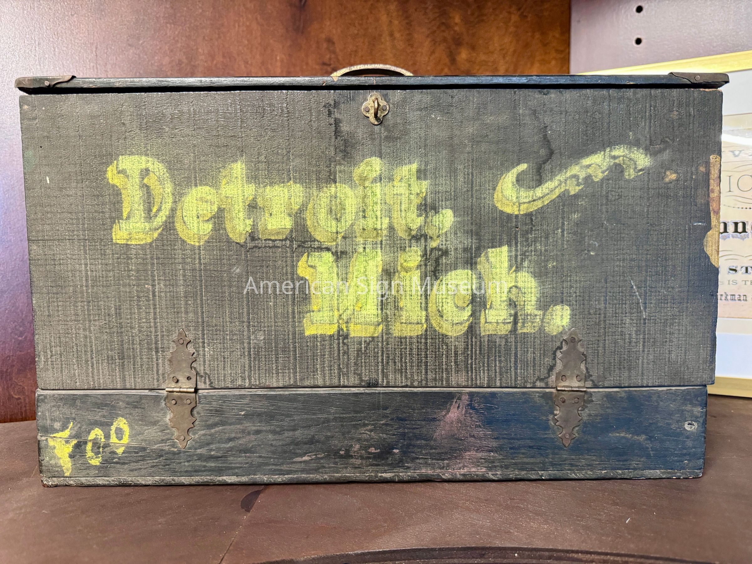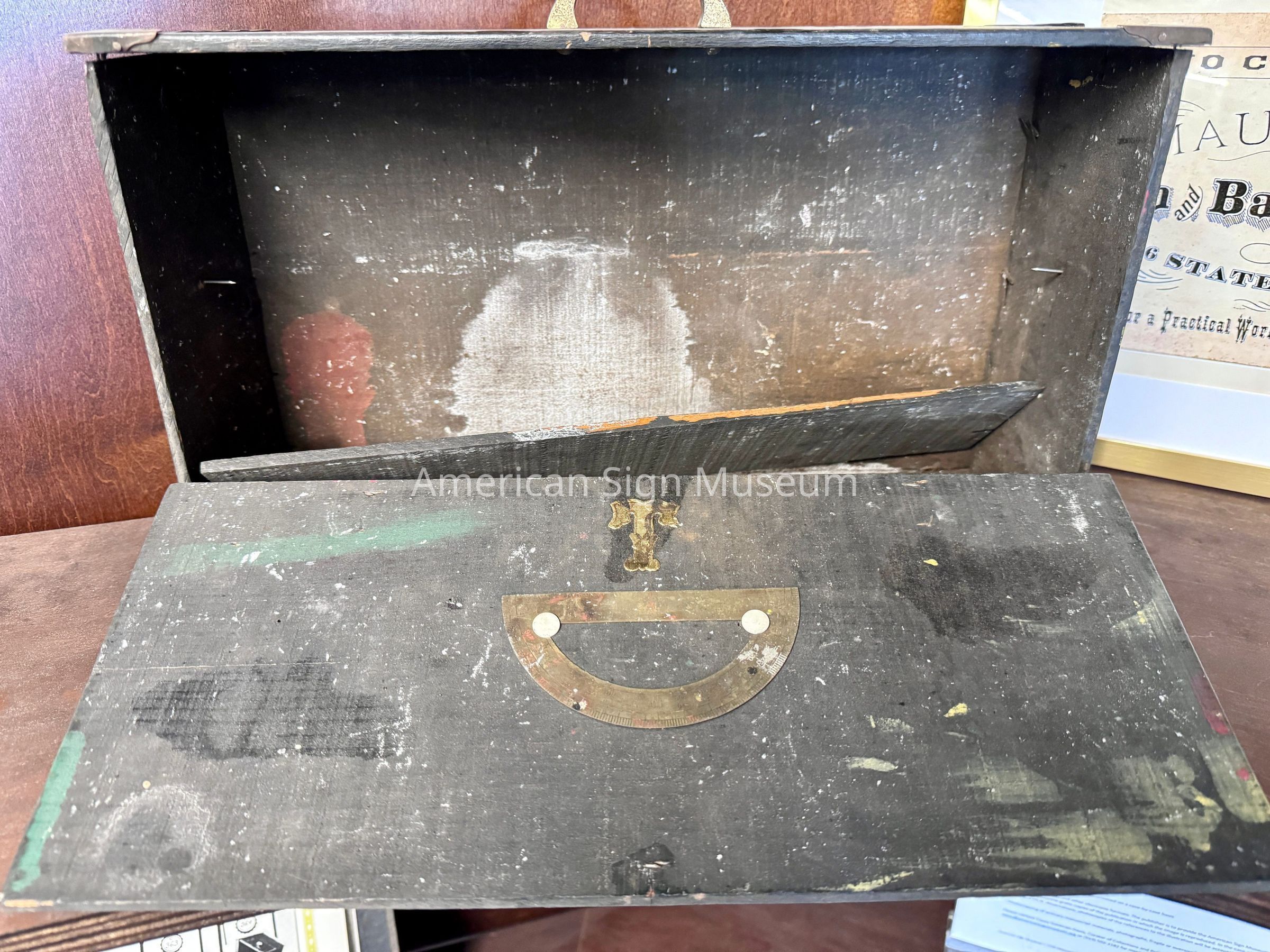 A small wooden sign kit box that was hand-lettered to read, "Trade Marks & Specialty Signs." Red, yellow and white paint was used. There is faded, unreadable lettering on the top around its metal handle. Its backside reads, "Detroit Mich." and opens up to reveal more storage. Inside, there is an embedded, golden half protractor.Collection