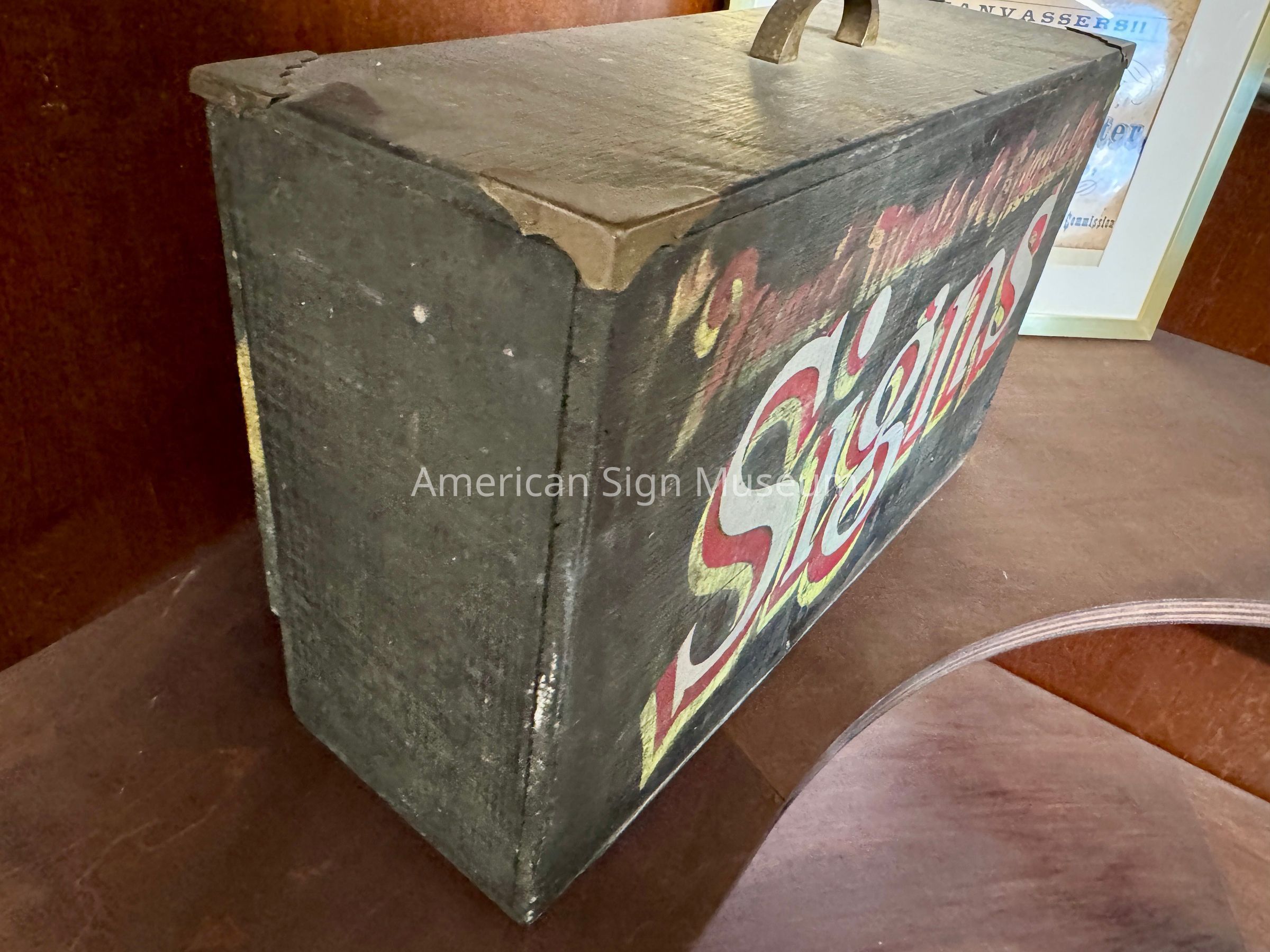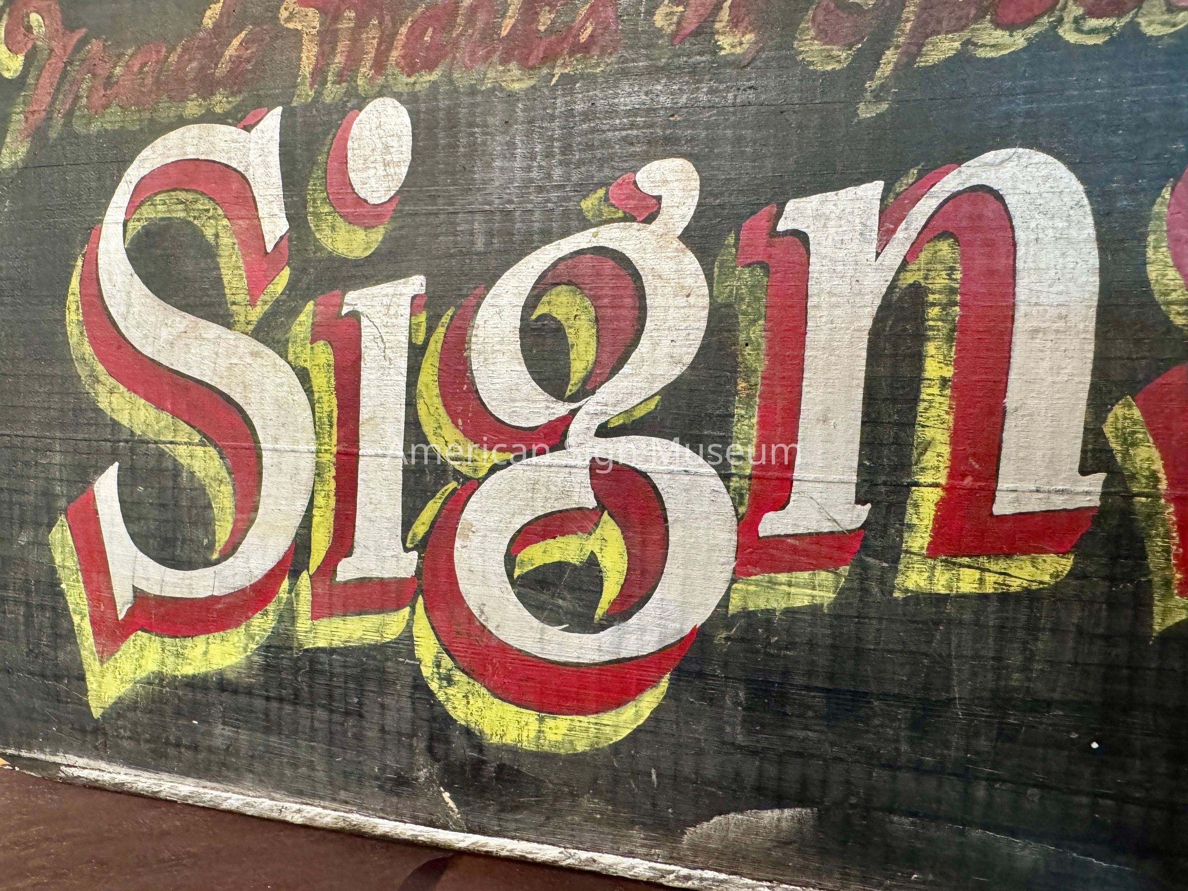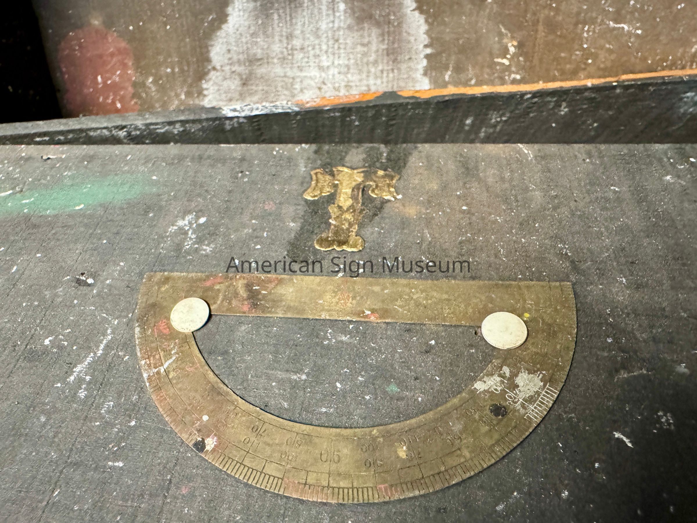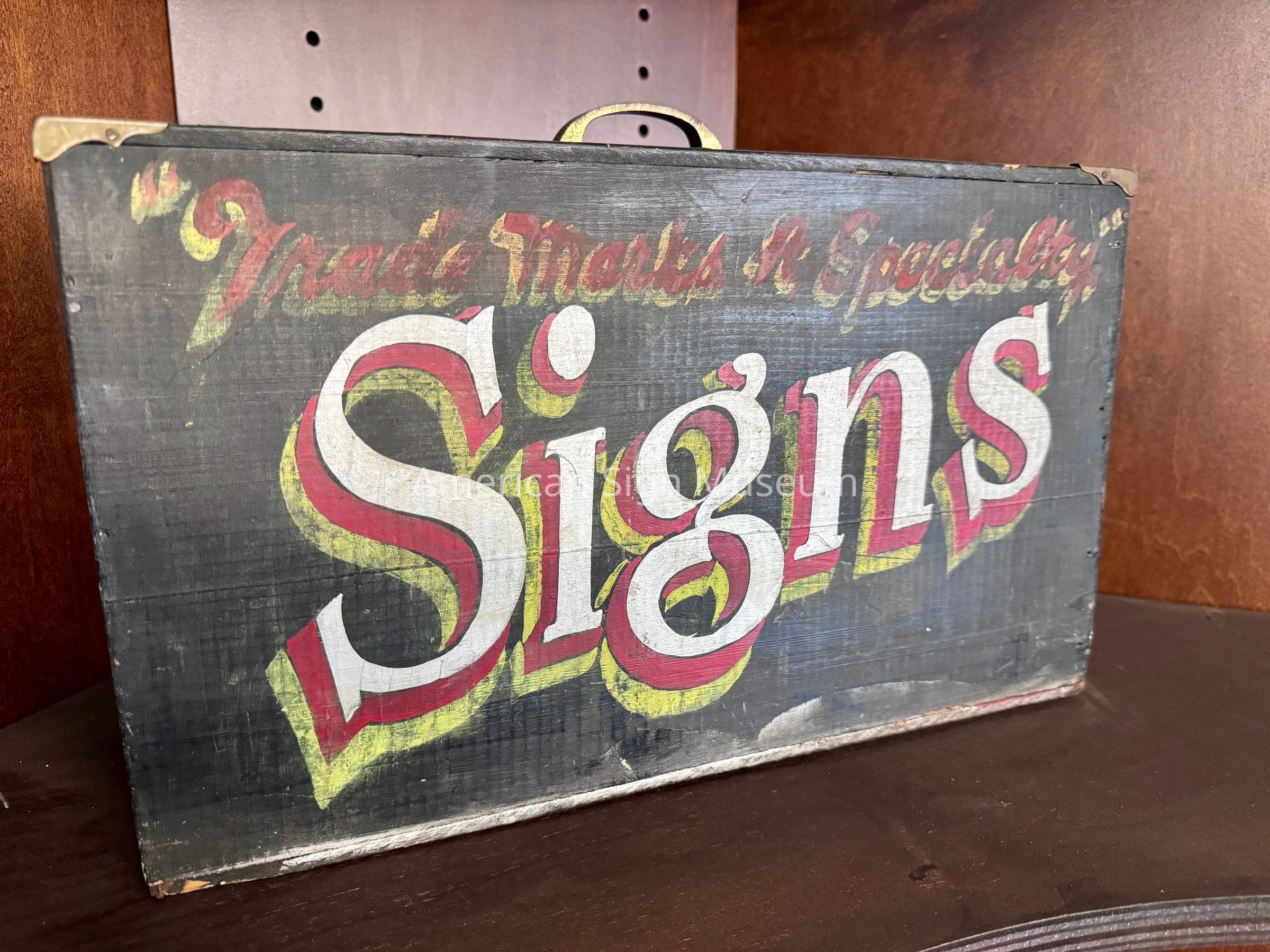A small wooden sign kit box that was hand-lettered to read, "Trade Marks & Specialty Signs." Red, yellow and white paint was used. There is faded, unreadable lettering on the top around its metal handle. Its backside reads, "Detroit Mich." and opens up to reveal more storage. Inside, there is an embedded, golden half protractor.Collection