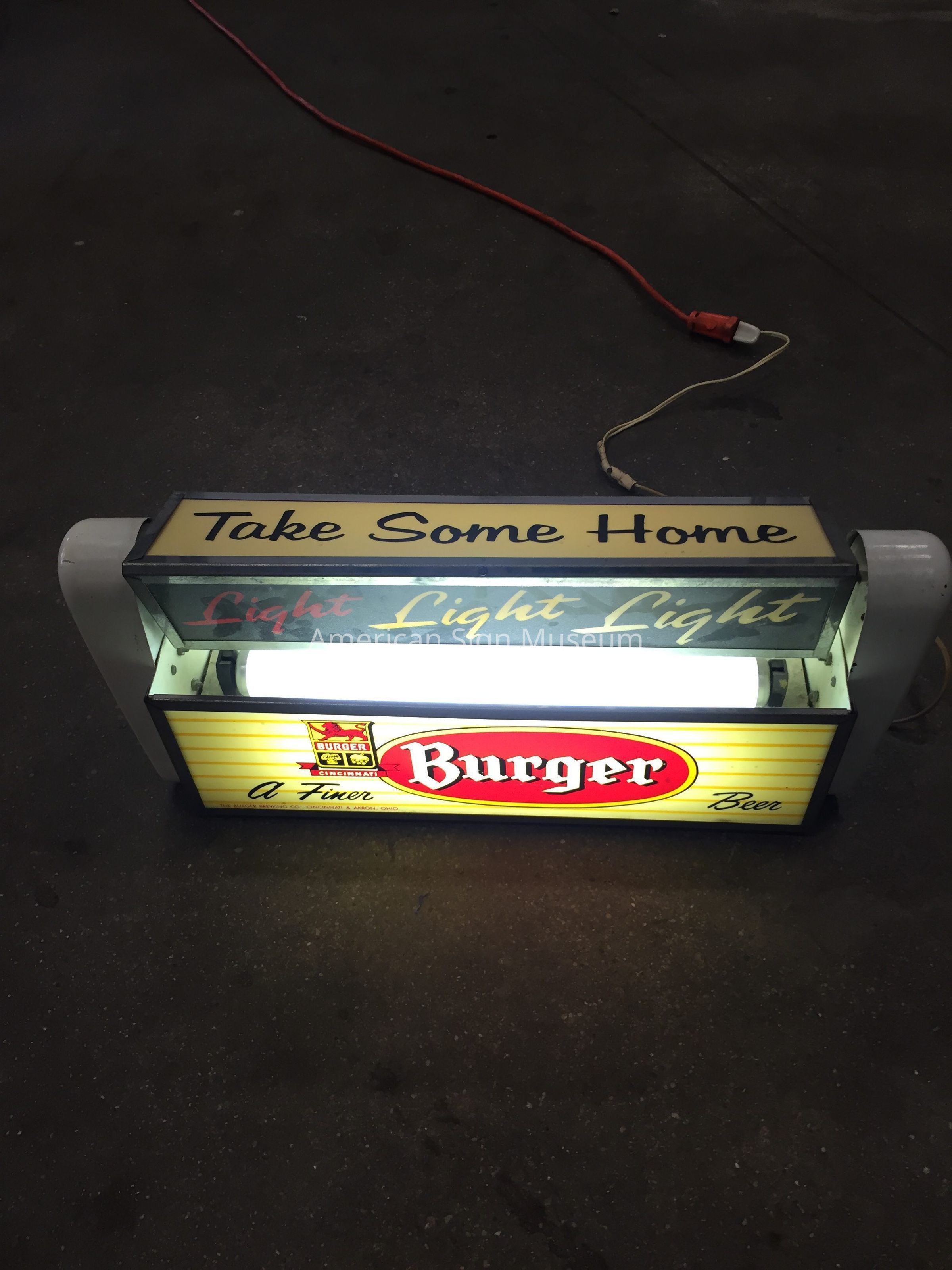 Late 1950s tri-panel revolving message countertop sign with three different messages. The reverse screen-printed plastic faces are internally illuminated. Cabinet is metal. Manufactured by the Countryman Co, Inc., 36th Street Covington, KY.Collection