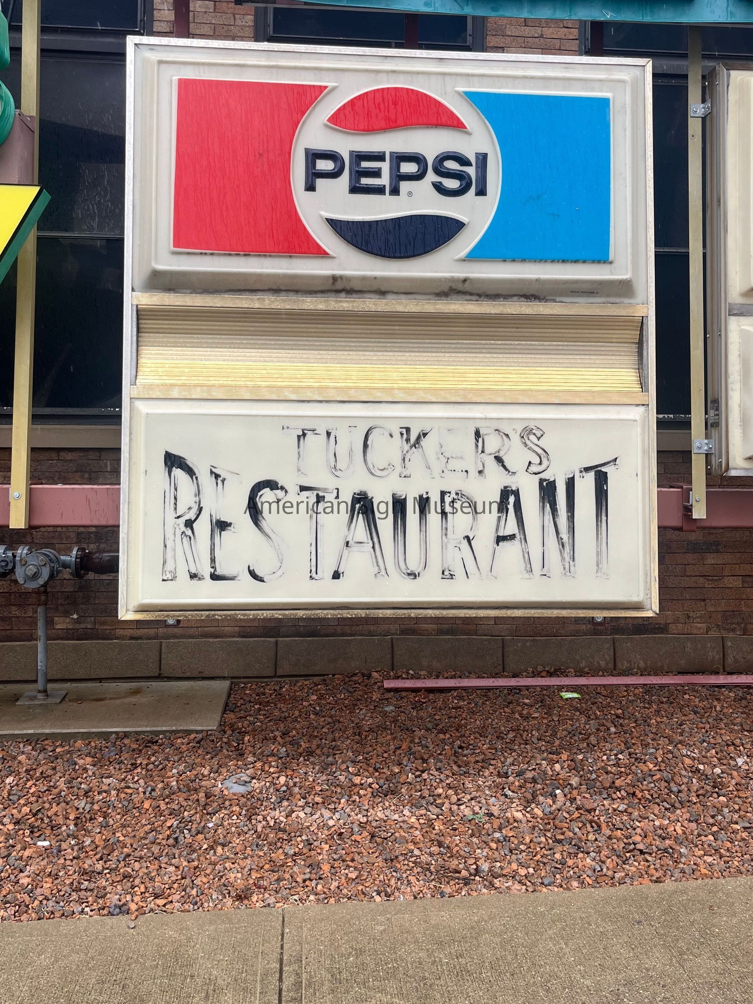 Single-faced, internally LED illuminated, plastic pan sign reading 'Pepsi; Tucker's Restaurant'. The Pepsi lettering is plastic and the Tucker's letting is hand-painted.Collection