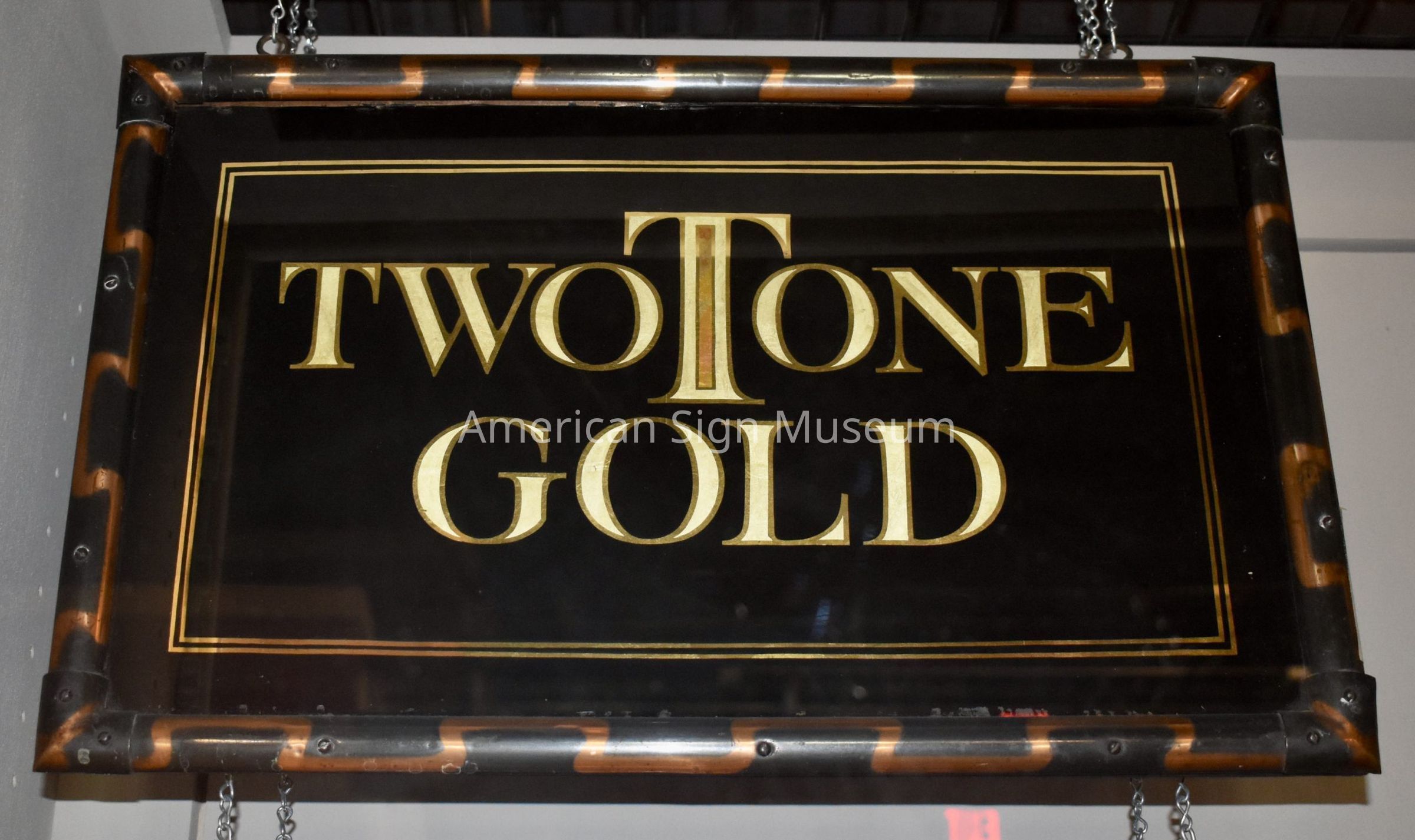 Goldleaf glass "Two Tone Gold" sign by Alf Becker with copper frame.